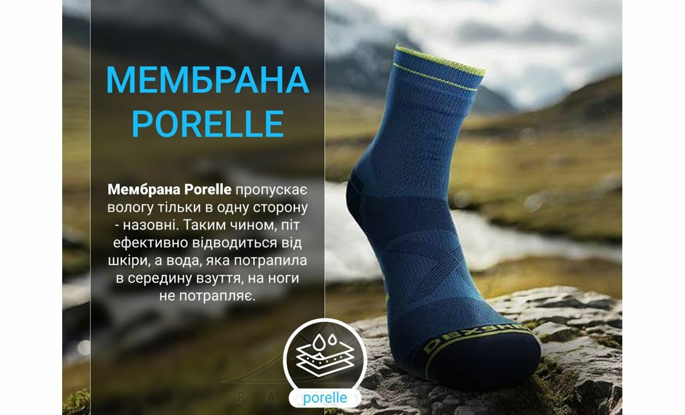 зовнішній: 80% нейлон, 12% поліестер, 5% еластан, 3% бавовна; середній: мембрана Porelle®; внутрішній: 60% поліестер Coolmax®, 40% нейлон