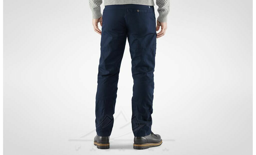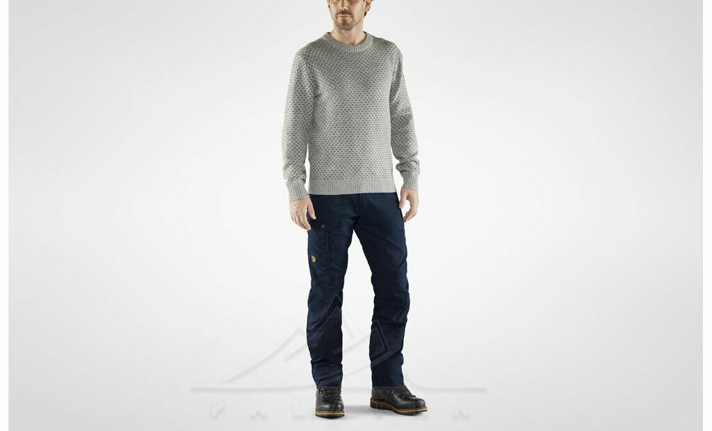 - Посилення в зоні колін спереду та ззаду із флагманської тканини Fjallraven G-1000® Eco — поєднання 65% переробленого поліестеру та 35% органічної бавовни, що забезпечує виняткову міцність, зносотійкість та добре пропускає повітря. За потреби тканину можна обробляти гренландським воском Greenland Wax для посиленого захисту від вітру та вологи.