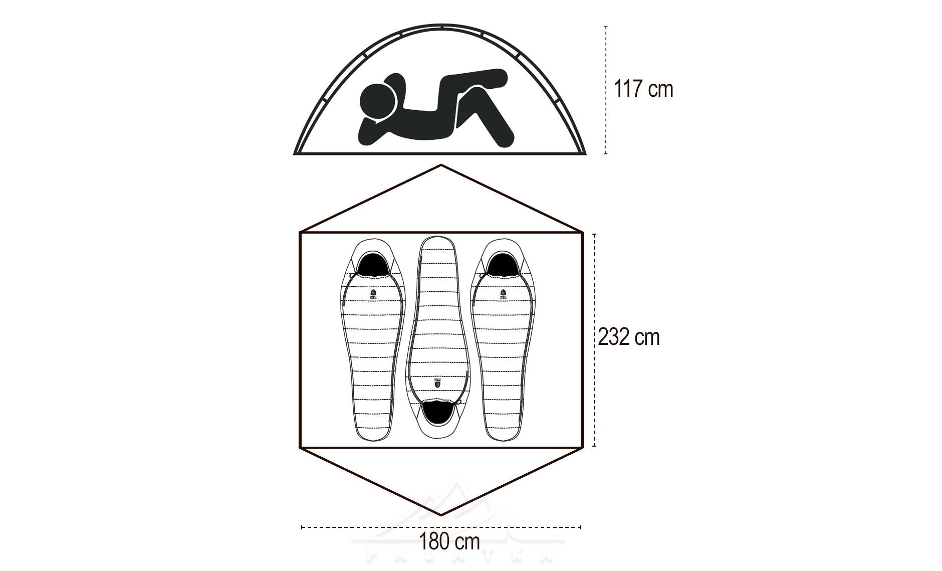 - 2 входи + 2 тамбури: зручно для 2–3 людей у кемпінгу/поході — кожному свій вихід, а речі зберігаються в тамбурах, щоб у спальні було вільніше.