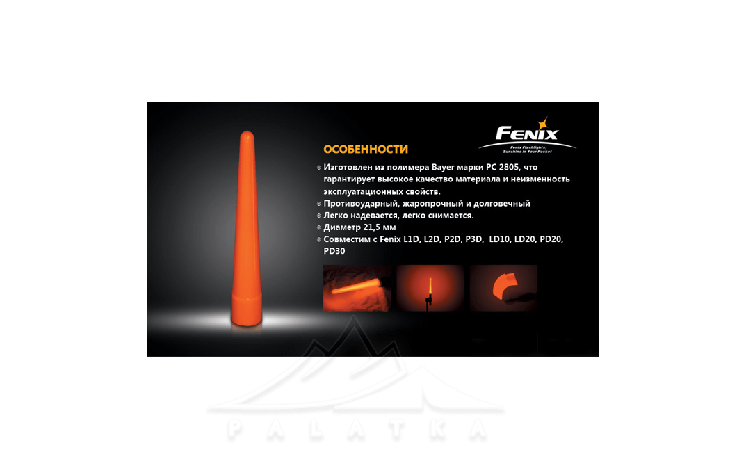 Сигнальный жезл Fenix AD201 - пластиковая, яркого цвета насадка на фонарь , которая предназначена для подачи световых сигналов в темное время суток. Данная модель совместима с фонарями Fenix PD25, LD09, LD12, LD22, E12, E15, RC05, RC09, HL23