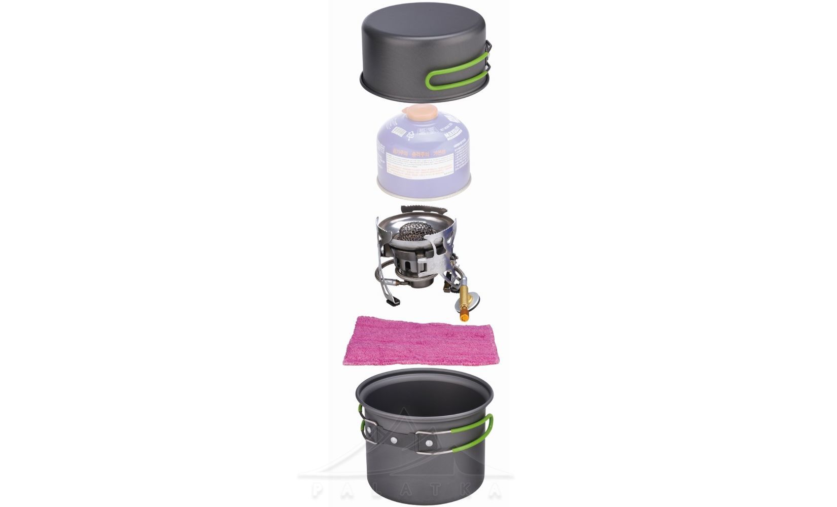 • Весь комплект системи компактно складається у каструлю, також можна покласти балон на 100 чи 230 г (не комплектується балоном).