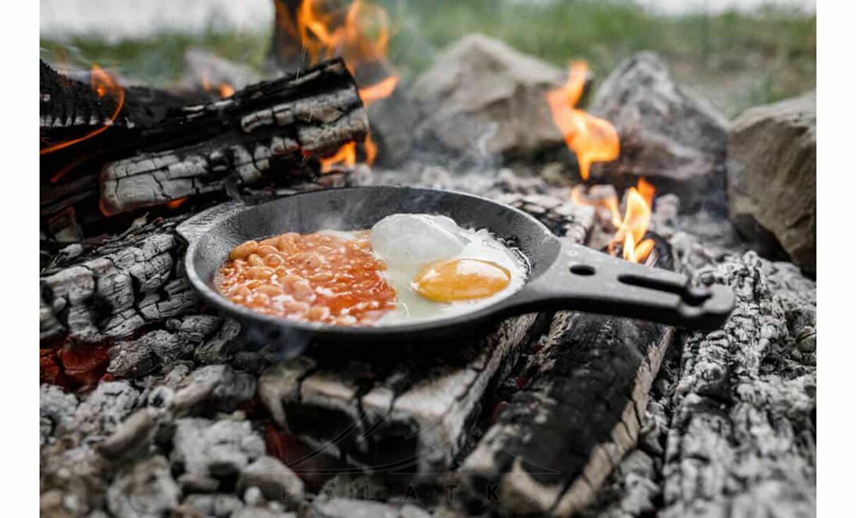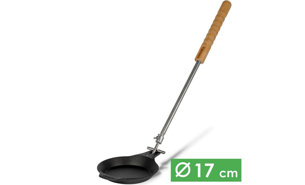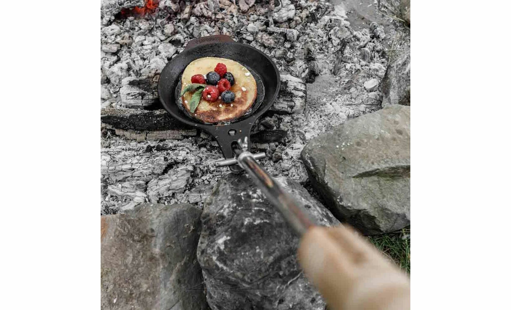 Cast-Iron Campfire — компактна чавунна сковорода з довгою знімною регульованою ручкою, для приготування їжі на вогнищі. Підходить для тушкування, обсмажування або запікання на будь-якій поверхні — електричній, газовій плиті, в духовці, або на решітці-грилі.