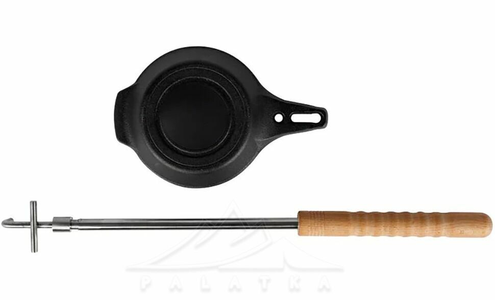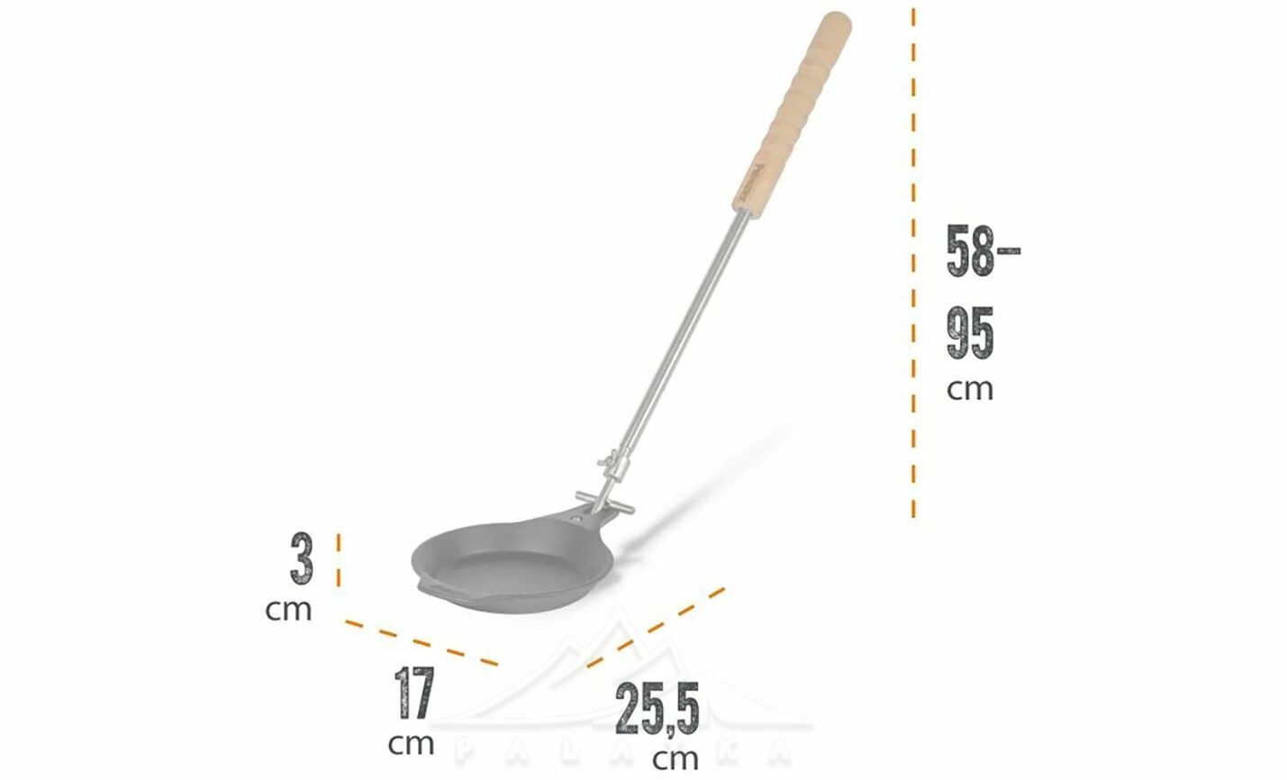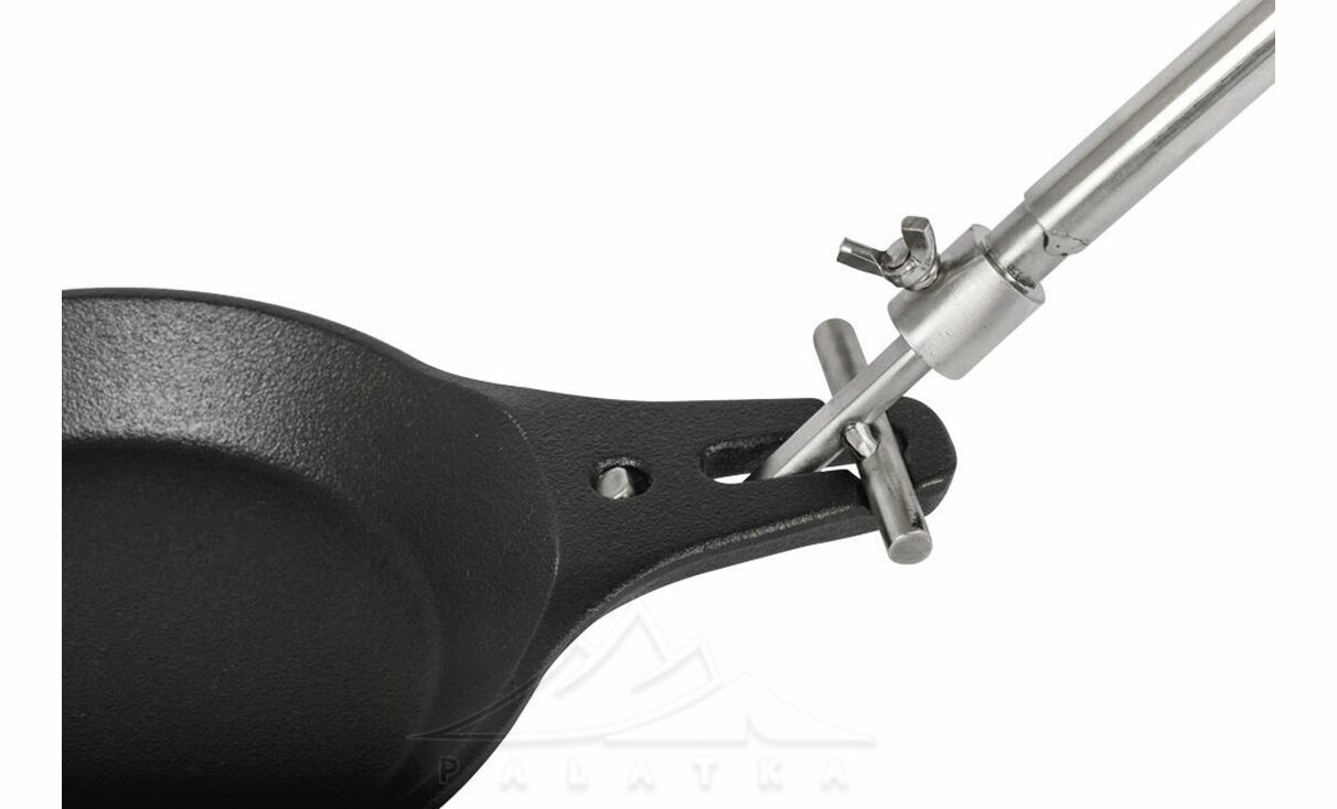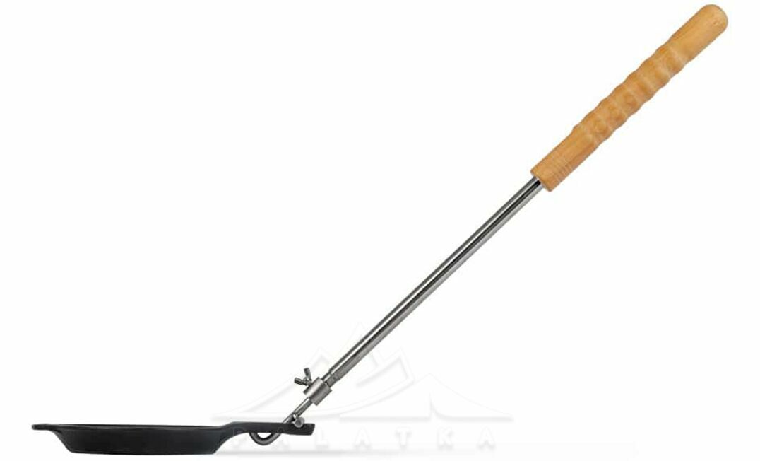 - Знімна ручка з регулюванням довжини від 58 до 95 см дозволяє індивідуально налаштовувати, зручніше тримати сковорідку під час приготування, та ставити на вогнище.