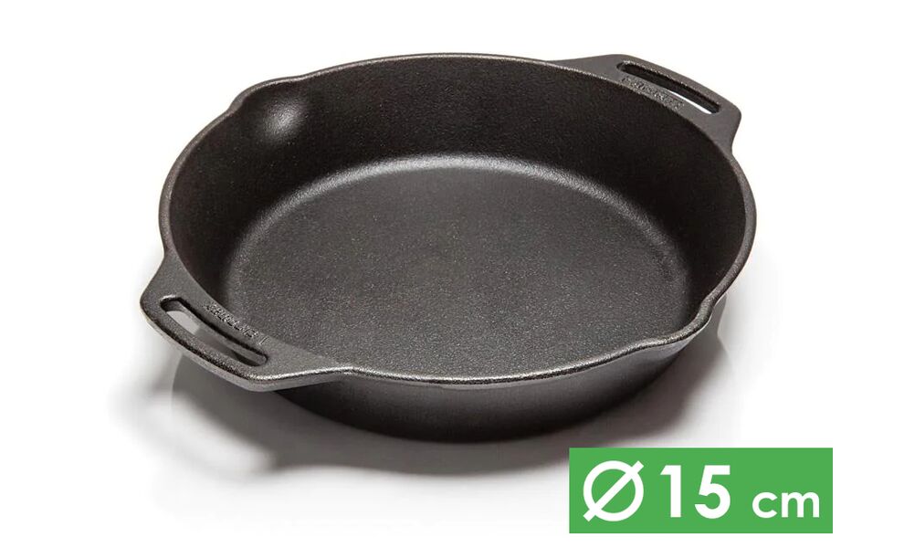 - Дві надійні литі петлебодібні ручки з чавуну для фіксації над вогнем та підтримки посуду рукою.