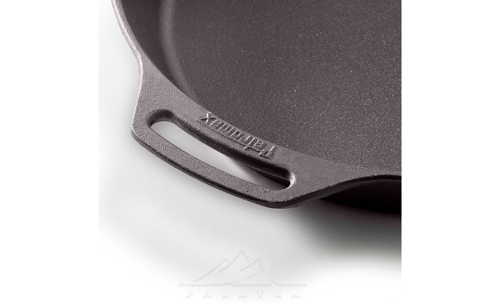 • Надійна лита довга та петлебодібна ручка з чавуну. Довга ручка дозволяє зручніше тримати сковорідку під час приготування їжі, та ставити на вогнище. Петлеподібна ручка - для фіксації над вогнем та підтримки посуду рукою.
