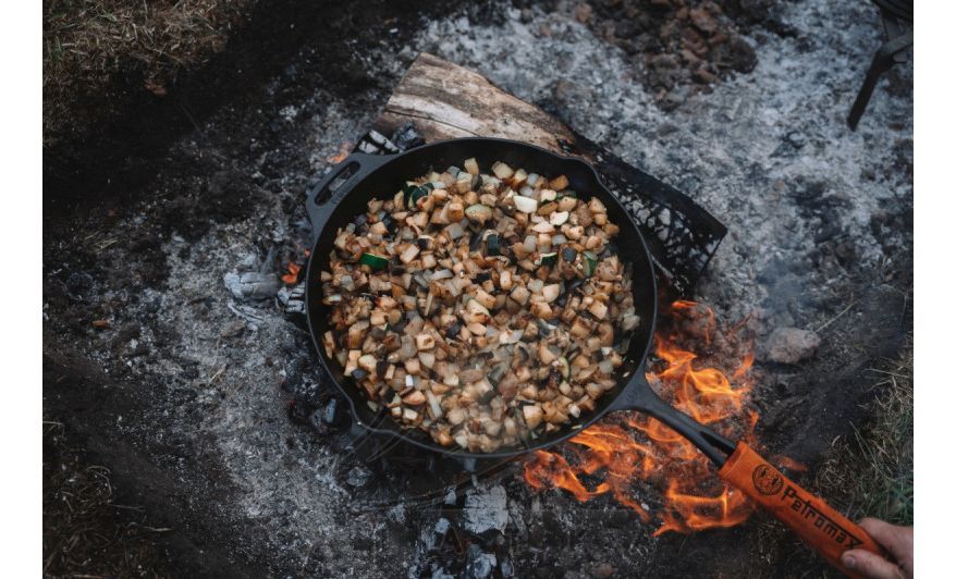 Сковорода Petromax Fire Skillet — чавунна сковорода з довгою ручкою, для приготування їжі на вогнищі, та домашній кухні. Підходить для тушкування, обсмажування або запікання на будь-якій поверхні - електричній, газовій плиті, в духовці, або на решітці-грилі.