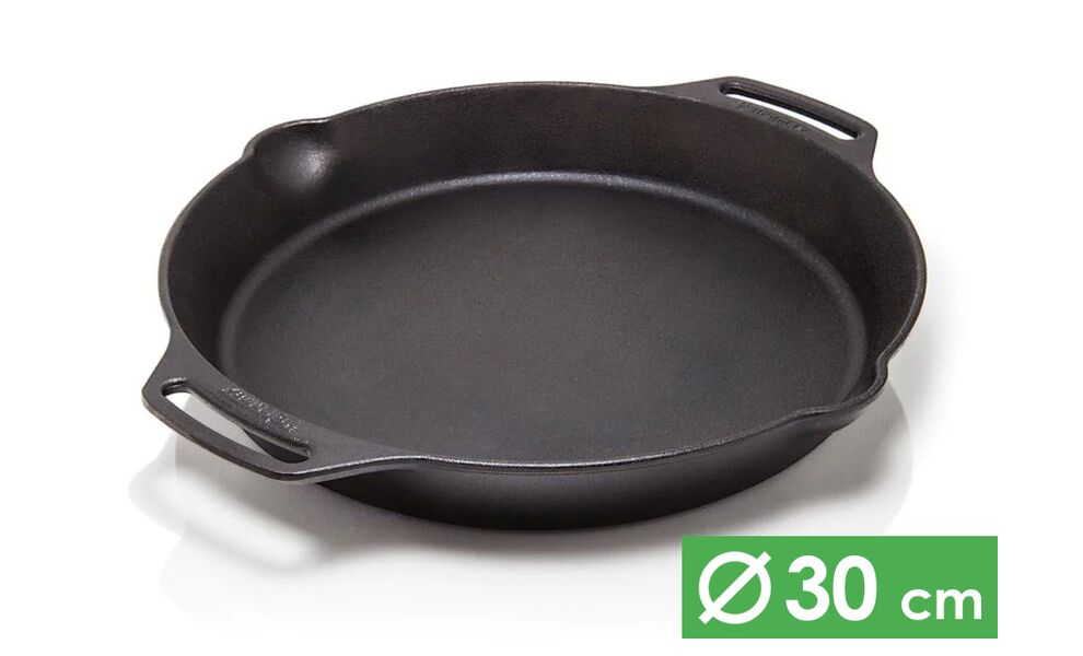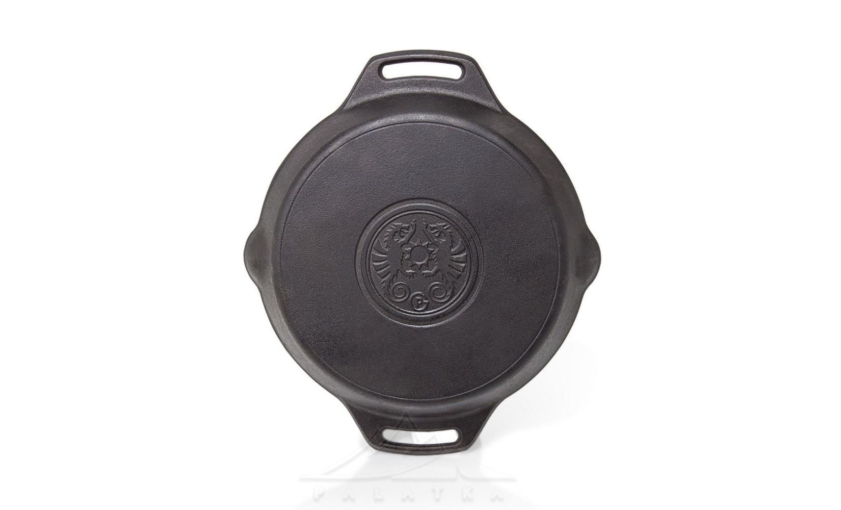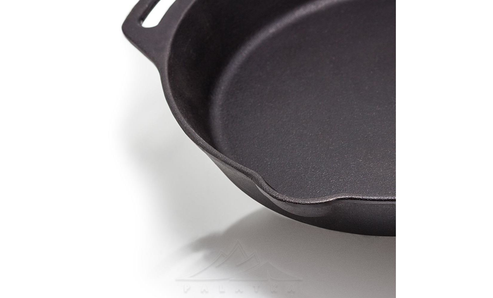 • Дві надійні литі петлебодібні ручки з чавуну для фіксації над вогнем та підтримки посуду рукою.