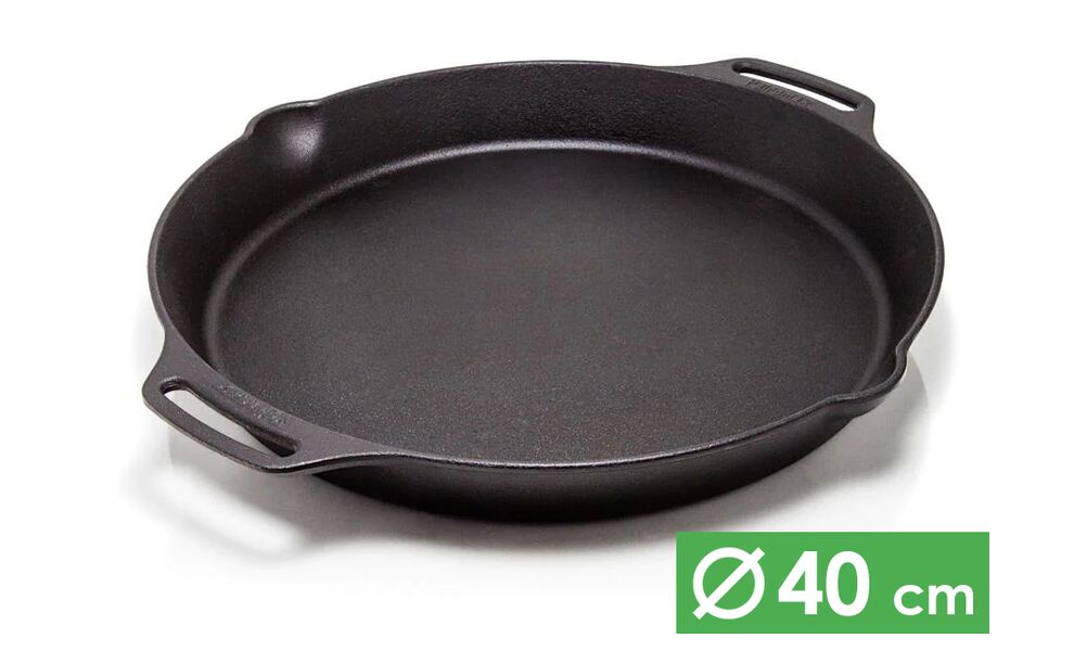 • Дві надійні литі петлебодібні ручки з чавуну для фіксації над вогнем та підтримки посуду рукою.
