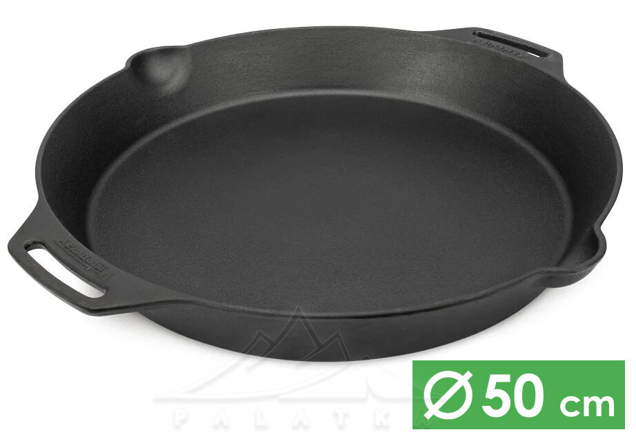 • Дві надійні литі петлебодібні ручки з чавуну для фіксації над вогнем та підтримки посуду рукою.