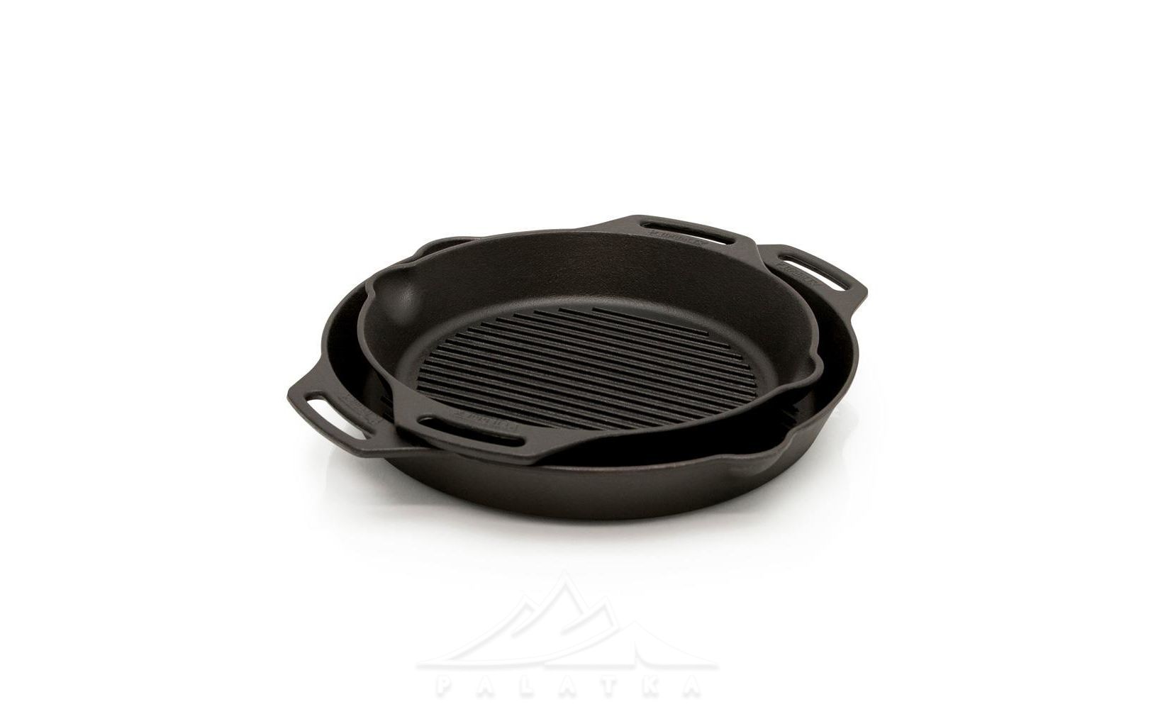 - Дві надійні литі петлебодібні ручки з чавуну для фіксації над вогнем, розміщення у духовці, та підтримки посуду рукою.