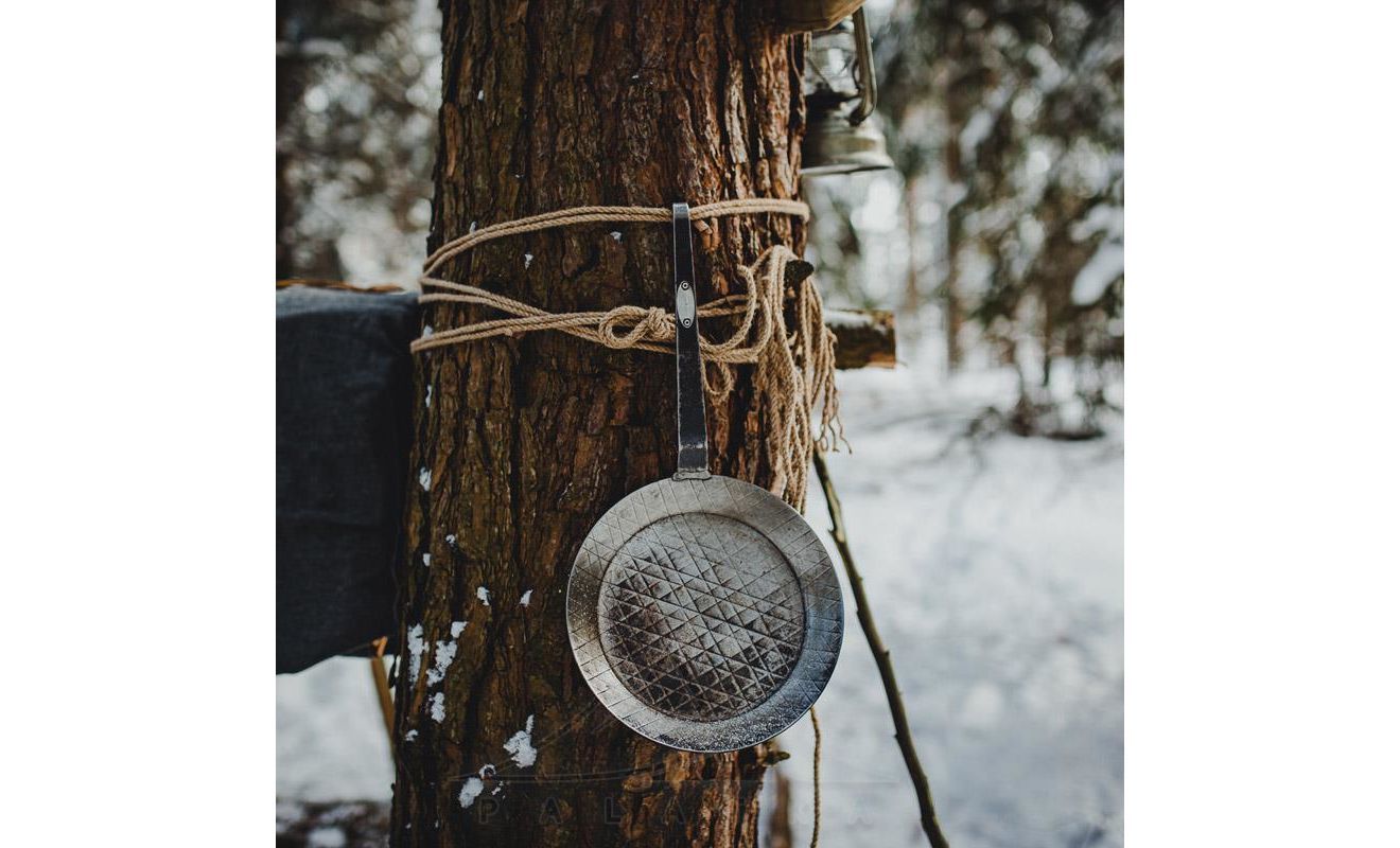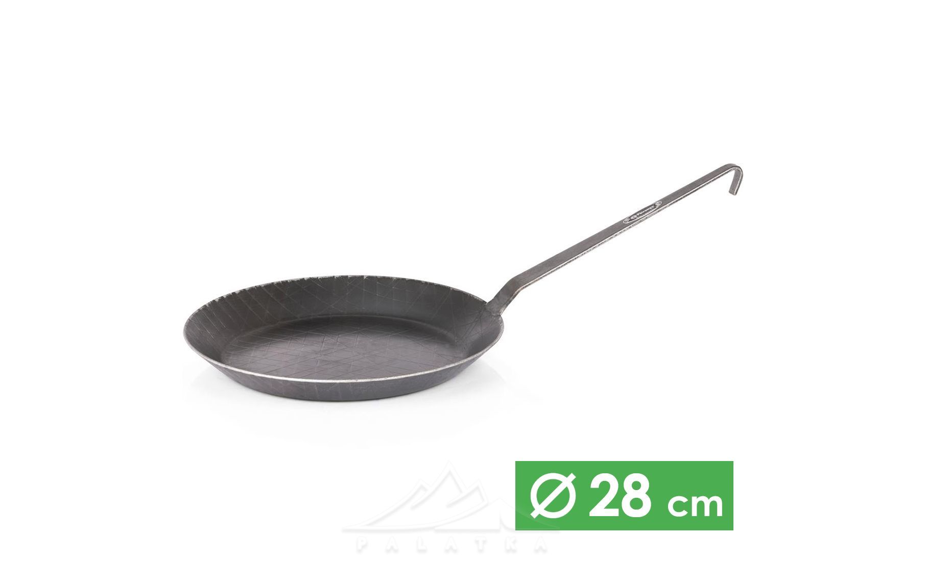 - Довга ручка з вигином дозволяє зручніше тримати сковорідку під час приготування їжі, та ставити на вогнище. А завдяки вигину на кінці ручки можна зручно підвісити сковороду на гачок.