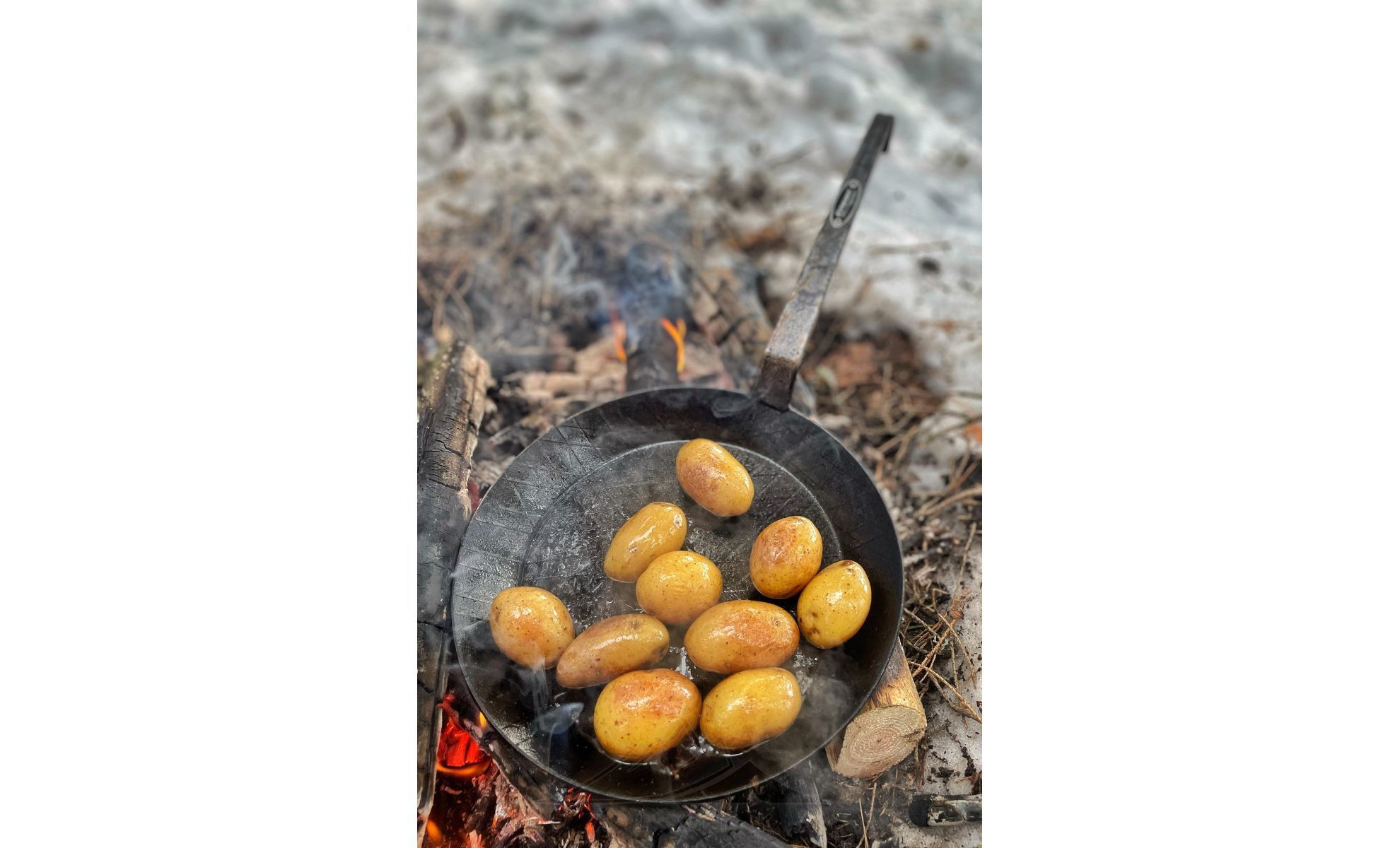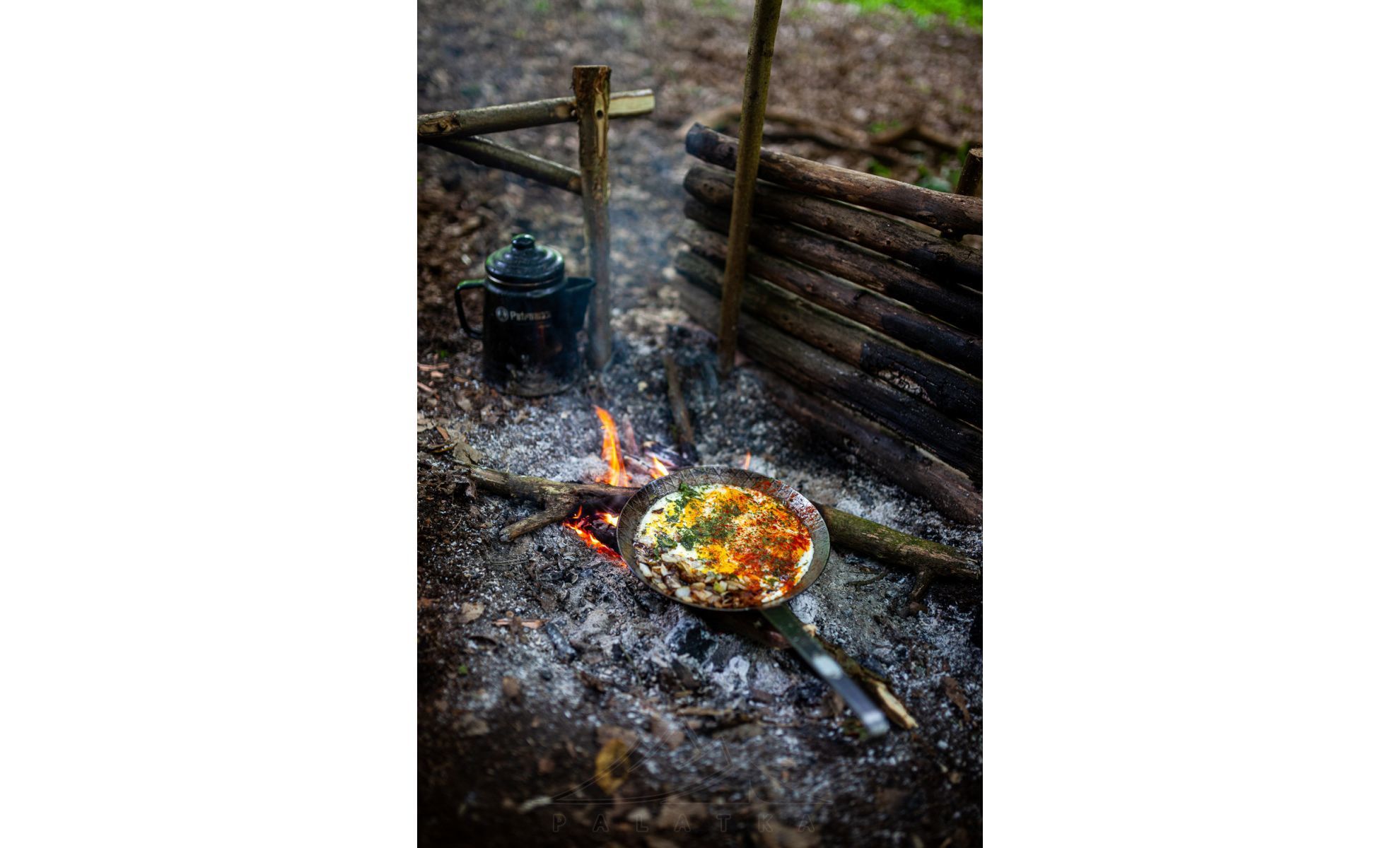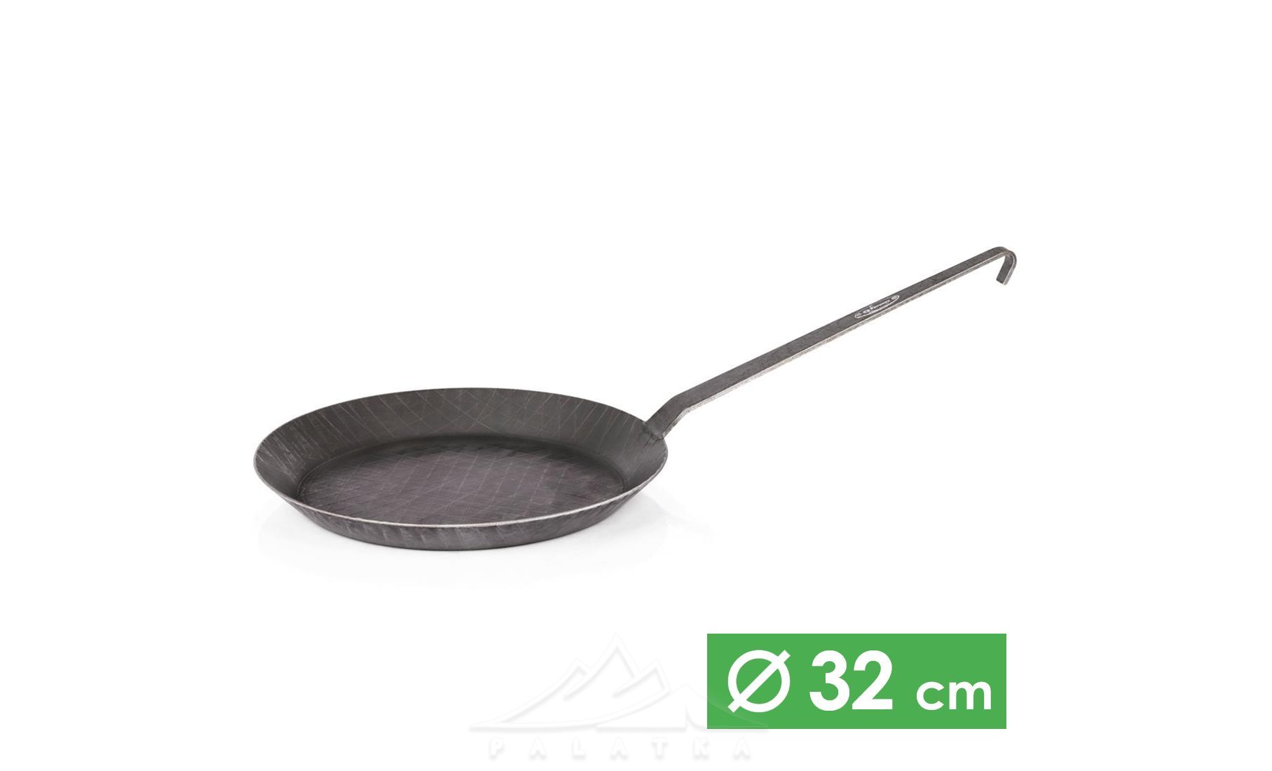 - Довга ручка з вигином дозволяє зручніше тримати сковорідку під час приготування їжі, та ставити на вогнище. А завдяки вигину на кінці ручки можна зручно підвісити сковороду на гачок.