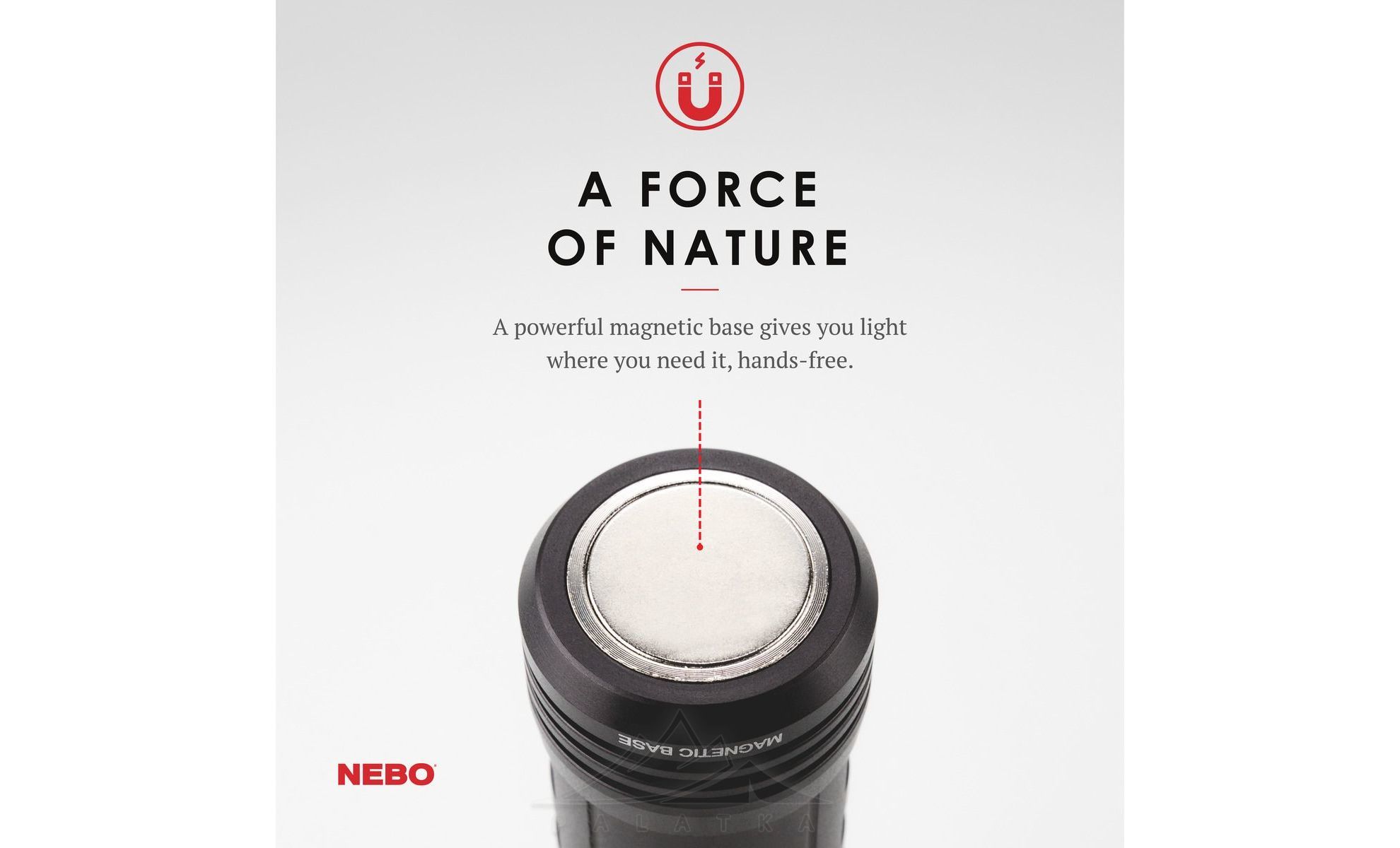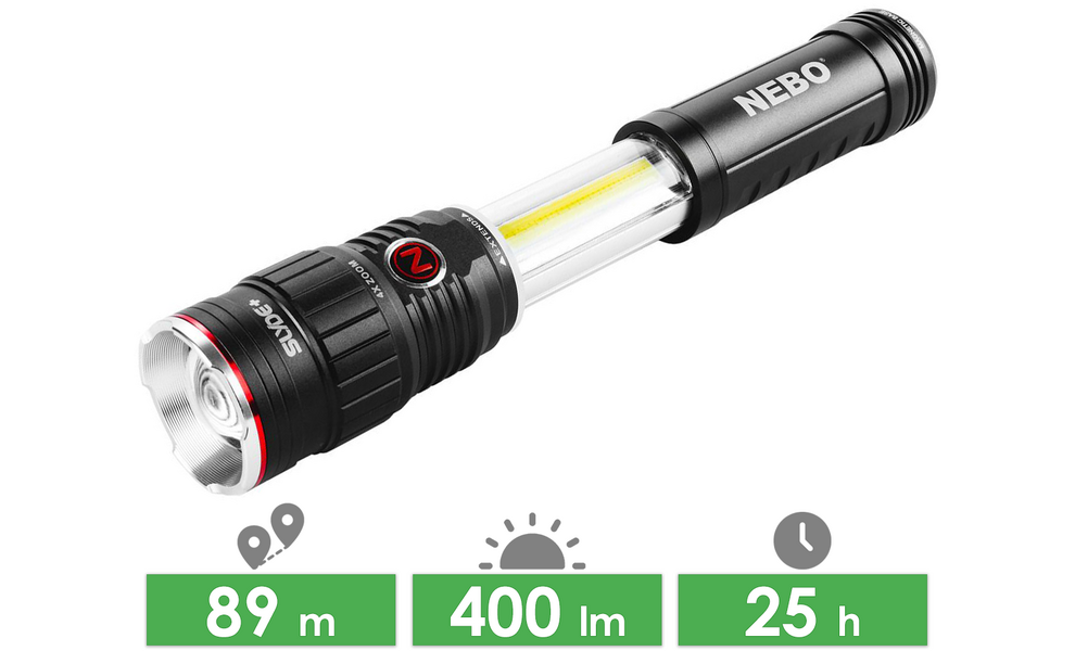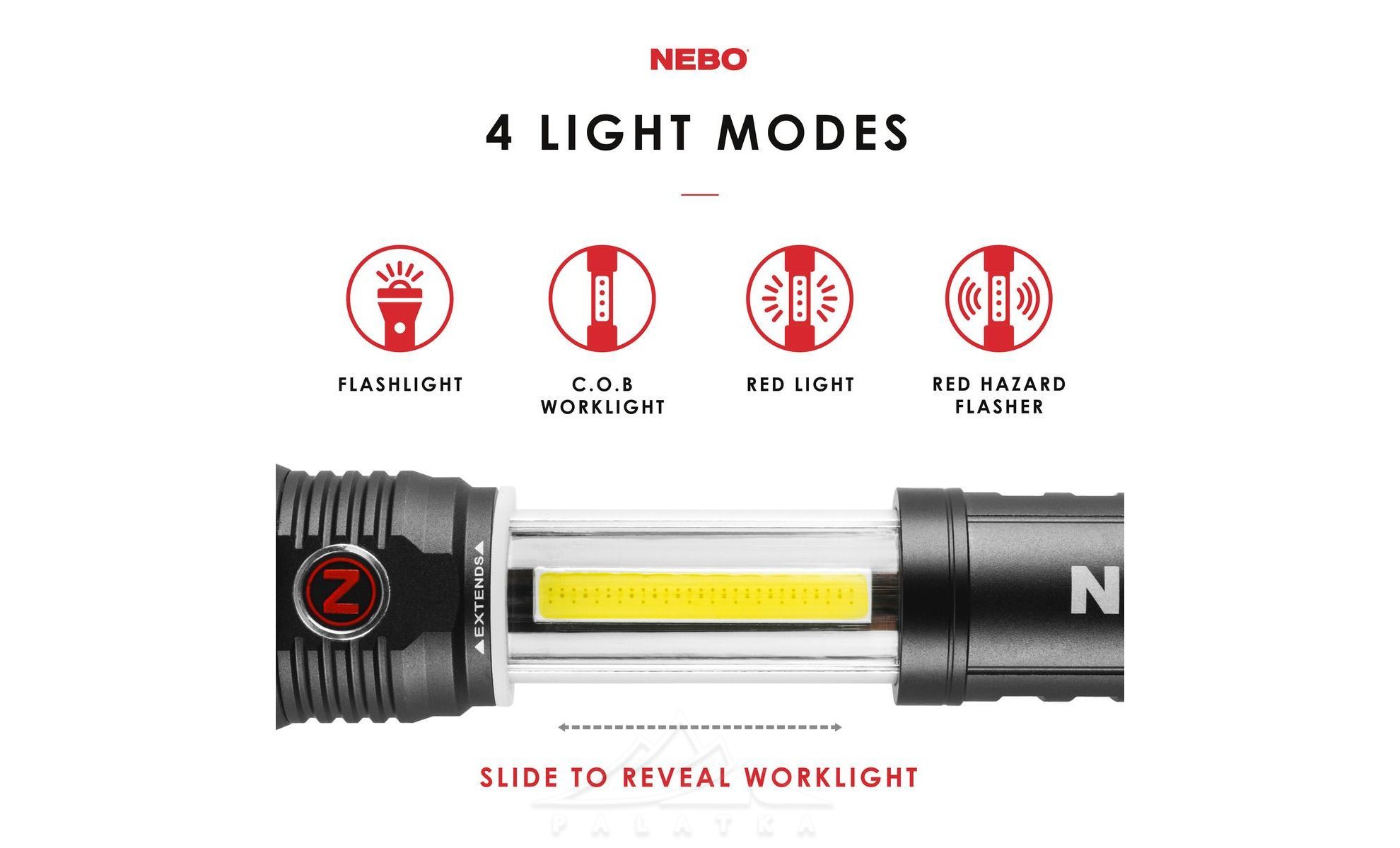 Ліхтар ручний Nebo Slyde + — універсальний EDC-ліхтар з розсувним корпусом, 4-кратним регульованим зумом та потужною магнітною основою. Підходить для повсякденного або робочого використання, а режим червоного світла може допомогти при екстрених ситуаціях.