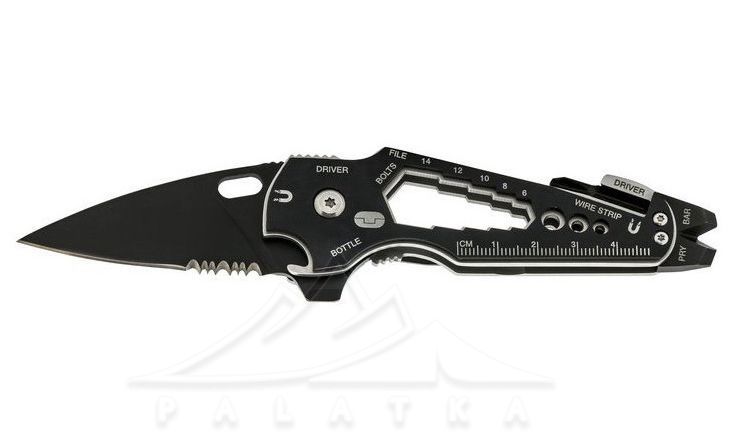 - Серед інших функцій: відкривачка, гайкові (шестигранні) ключі, зачищувачі дротів (3 розміри), пласкі викрутки (3 розміри), лінійка (см та дюйми), магнітний тримач для біт (1 хрестоподібна біта в комплекті), монтувалка, напилок.
