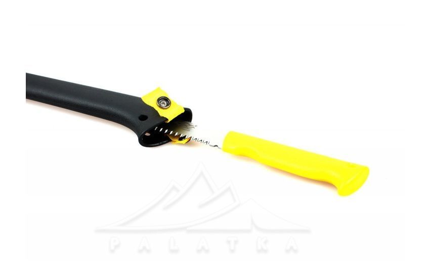 - В ручці сокири зберігається пила, яка легко та швидко дістається відстібуванням кнопки. Загальна довжина пили — 30 см, з яких 18 см — лезо.