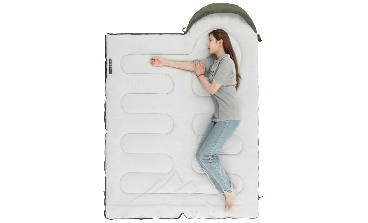 - Два таких спальника (правий та лівий) можна зістібнути разом і отримати один великий двомісний спальний мішок.