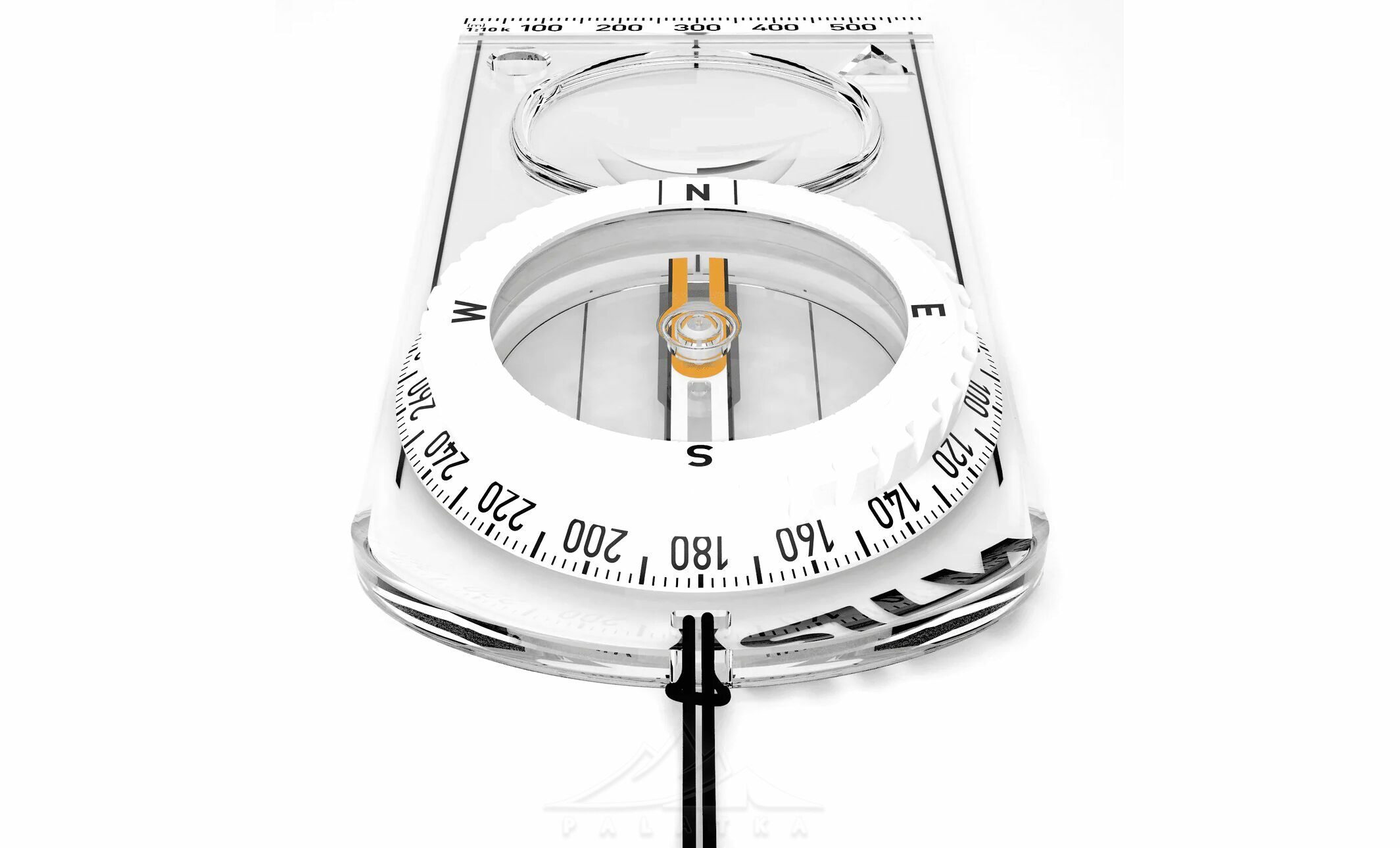 - Поворотний корпус з маркуванням на 360° і позначками напрямків (N, E, W, S).
