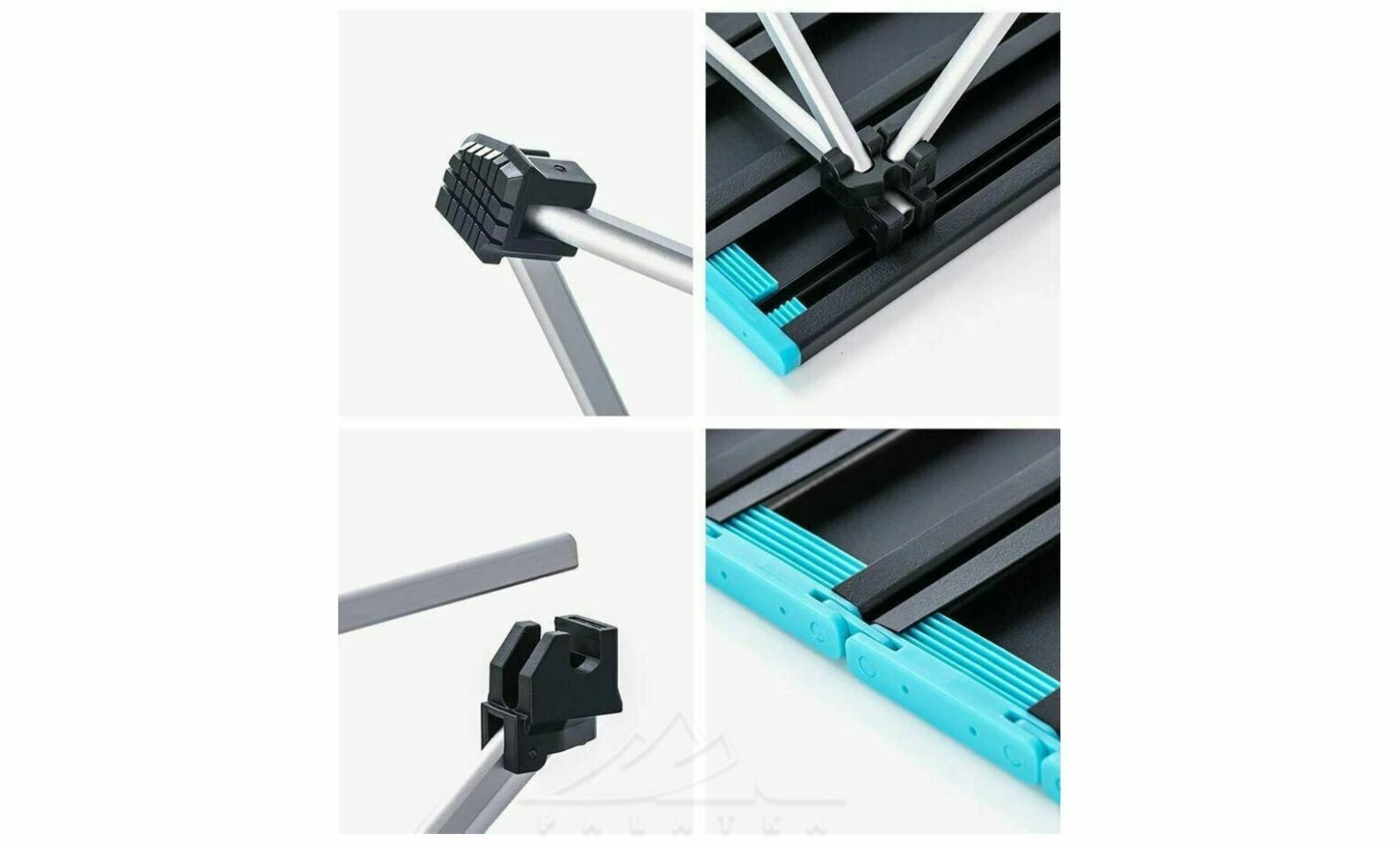 • Каркас та стільниця виготовлені з алюмінію - міцного та стійкого до корозії матеріалу, що полегшує вагу столика, порівняно з аналогами зі сталевим матеріалом.