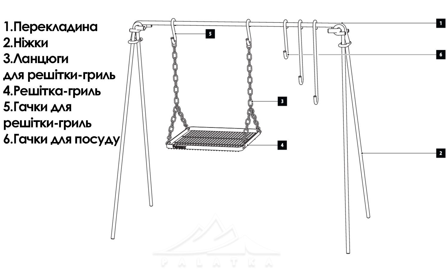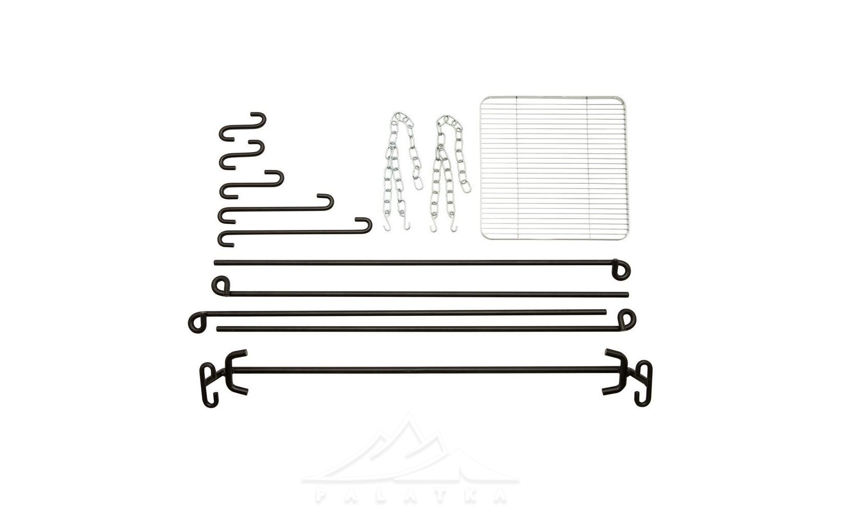 - Три гачки різної довжини (в комплекті) на які підвішується чавунний посуд, чайники на різній висоті для приготування страв та напоїв над вогнищем. Довжина гачків для посуду - 20 см, 33 см, 43 см.