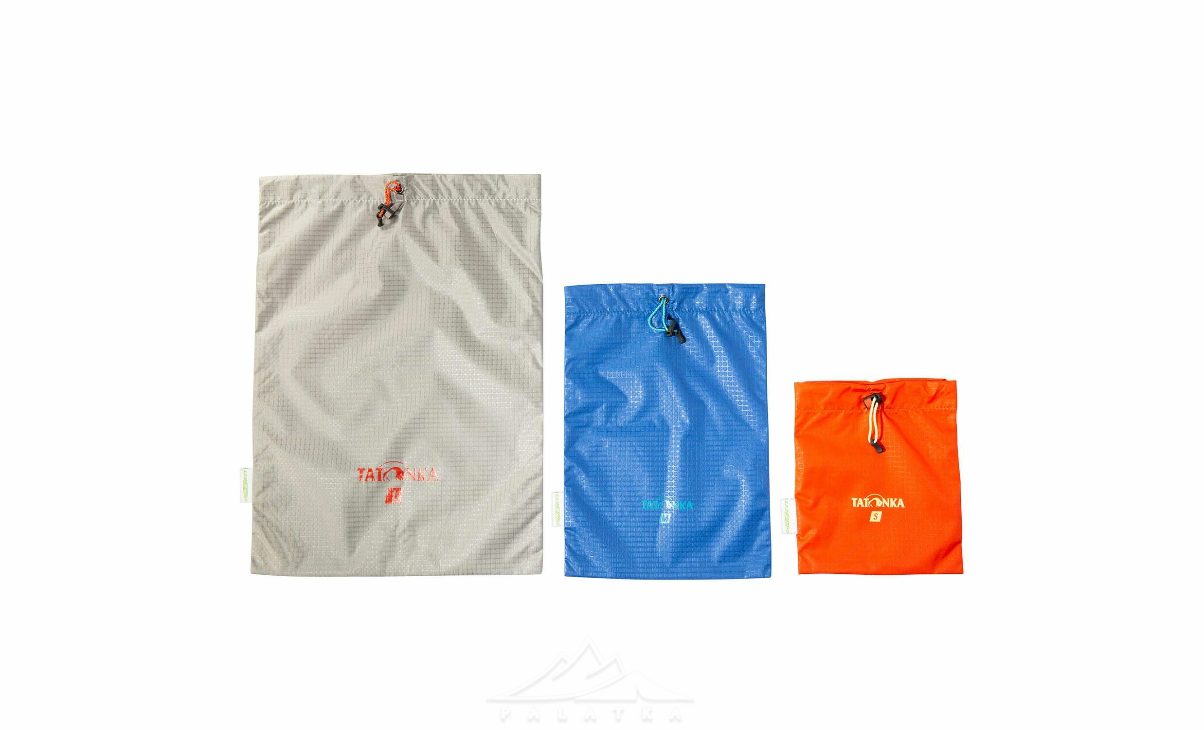 Tatonka Stuff Sack Set III — універсальний та легкий набір із трьох стяжних мішків різного об’єму для зберігання й організації речей. Вони допоможуть компактно пакувати спорядження, одяг чи аксесуари в рюкзак або дорожню сумку.