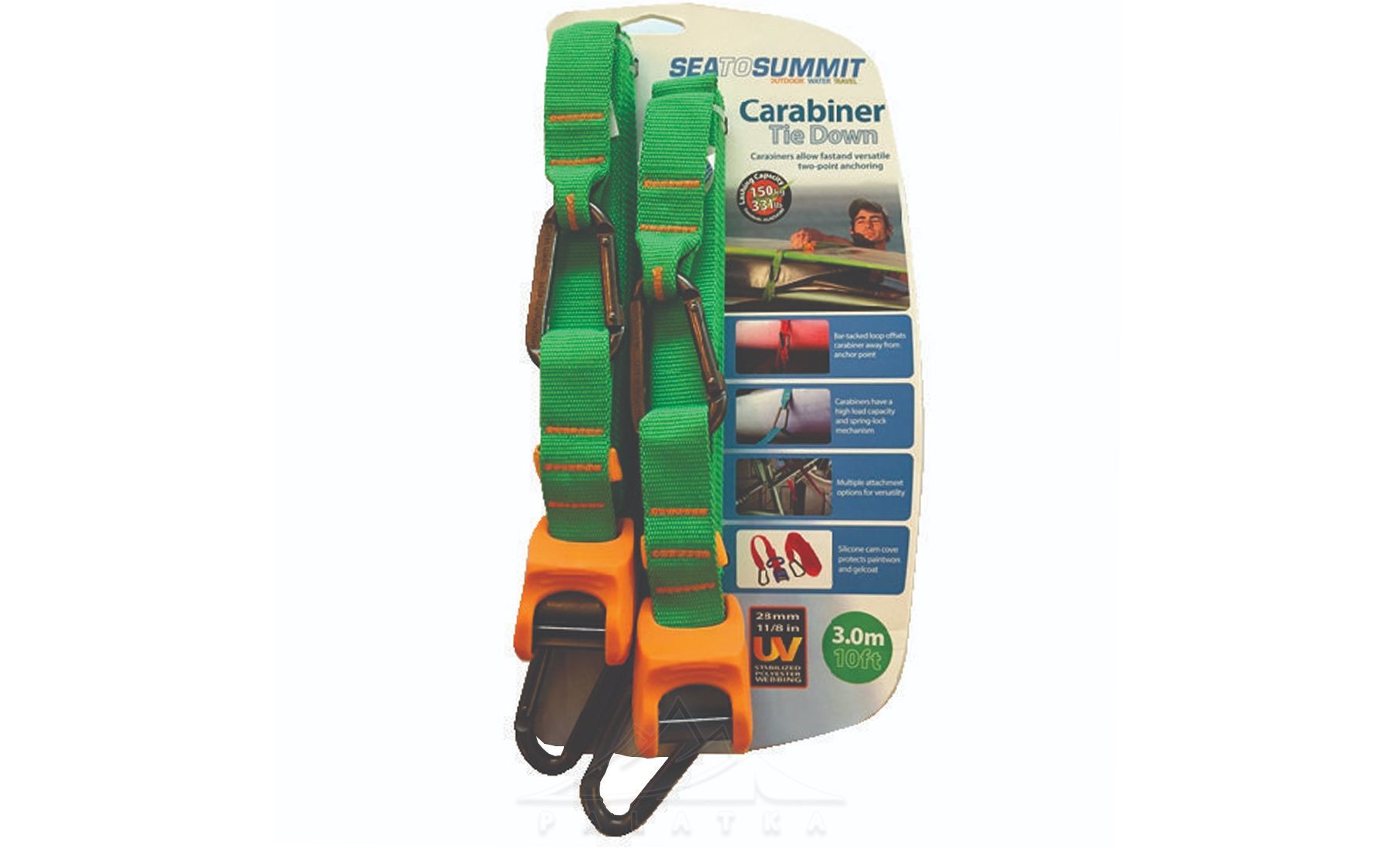 Sea to Summit Carabiner Tie Down — це набір з 2-х міцних стяжних ременів для транспортування великого спорядження (каяків, байдарок, сноуборду, тощо). Один ремінь являє собою систему з двох частин з карабінами, що дозволяє надійно і зручно закріпити багаж в двох окремих точках, різними способами.