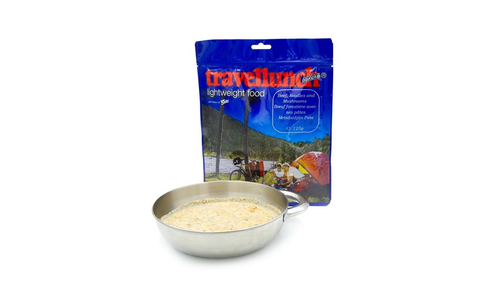 Сублімована страва Travellunch Локшина з яловичиною та грибами — сбалансована туристична їжа для походів, експедицій та подорожей. Дуже легко приготувати — тільки додати окропу або холодної та трохи зачекати.