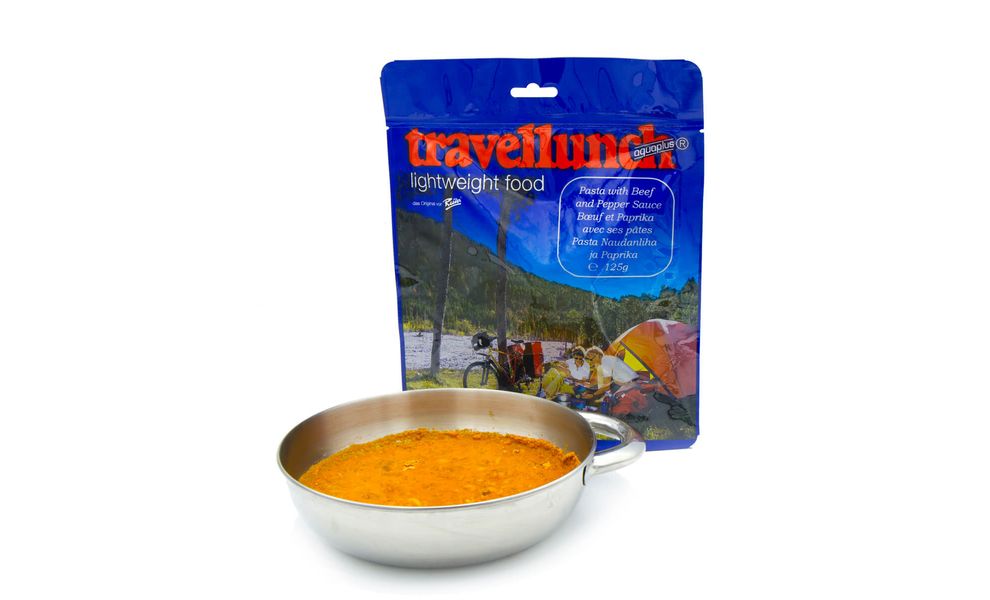 Сублімована страва Travellunch Паста з яловичиною та перцем — сбалансована туристична їжа для походів, експедицій та подорожей. Дуже легко приготувати — тільки додати окропу або холодної та трохи зачекати.