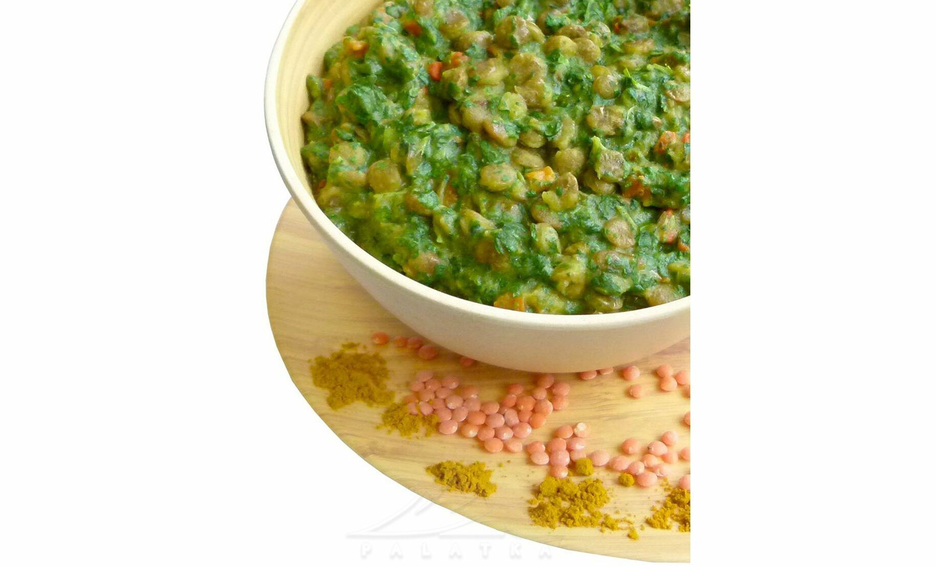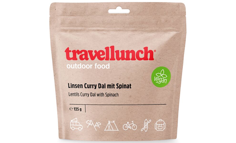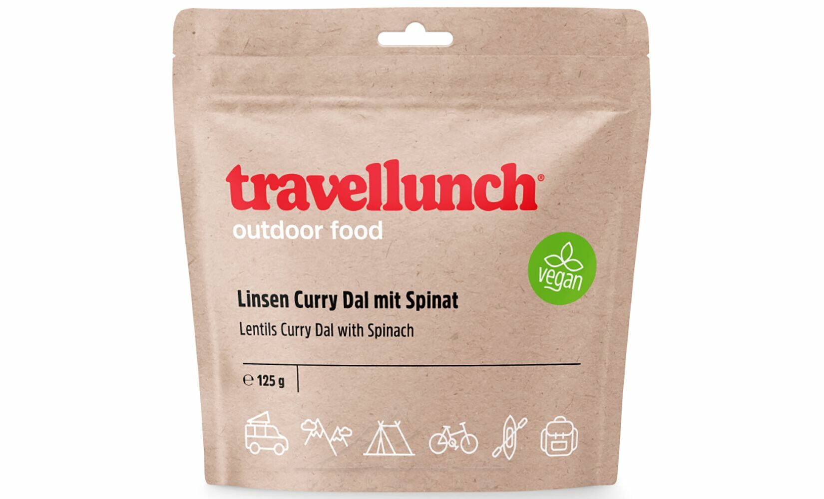 Сублімованна страва Travellunch Сочевиця-каррі дал зі шпинатом — пряна, поживна страва індійської кухні — ідеальний вибір для веганів та активних людей. Розрахована на 1 порцію.