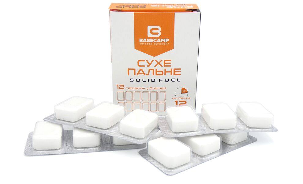 Сухе пальне BaseCamp Solid Fuel — спресовані таблетки сухого пального, які використовуються для розпалювання багаття, або як окреме паливо для розігріву їжі чи кип'ятіння води для туристів, рибалок й мисливців. Пальне має зручне пакування у вигляді блістеру по 3 таблетки.