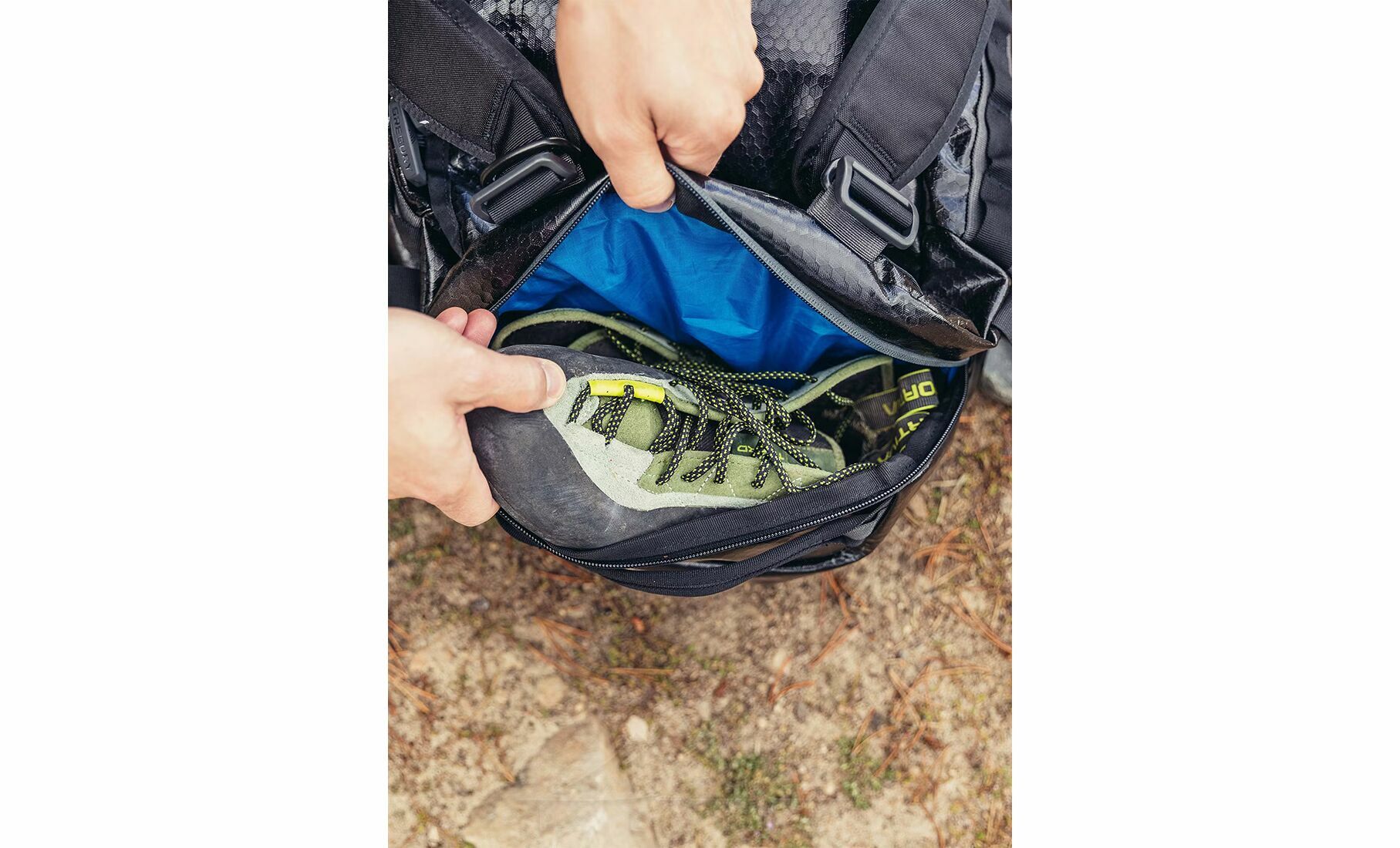 - Розширювана бічна кишеня на блискавці для зберігання взуття, брудного одягу чи спорядження окремо від основного відділення.