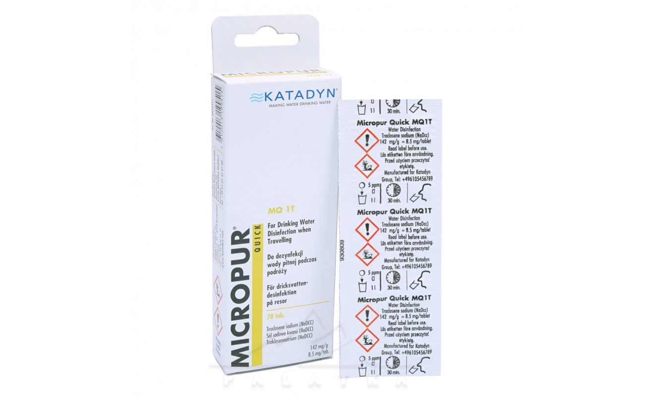 Micropur Quick MQ 1T — таблетки швидкої дії для дезінфекції питної води у поході чи для кемпінгу на природі. Містять хлор.