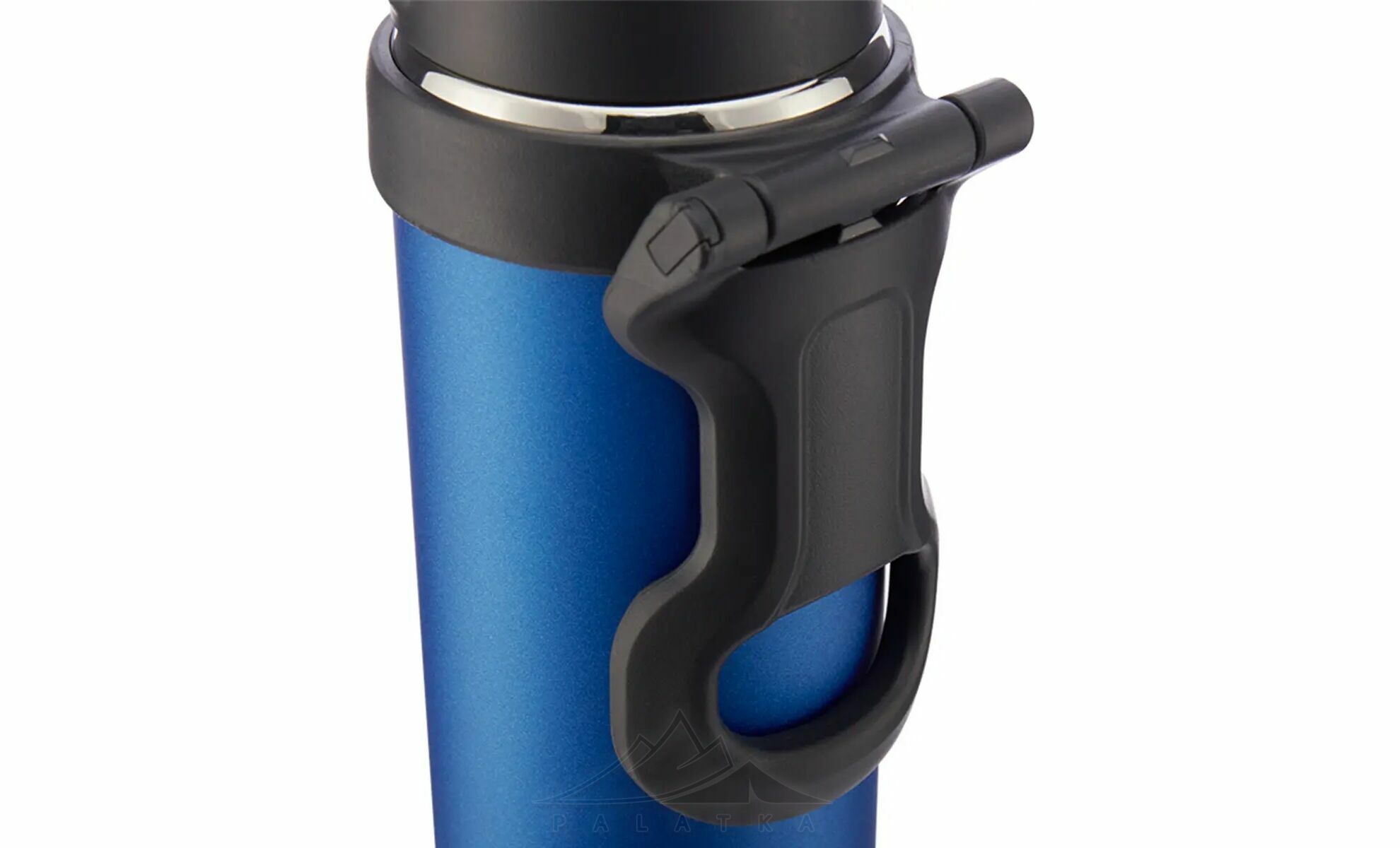 - Ергономічна складна ручка забезпечує комфортне утримання термокружки, зручну фіксацію на спорядженні або одязі (як кліпса), що дозволяє завжди мати її під рукою. Має фіксатори положення для комфортного транспортування та перенесення.