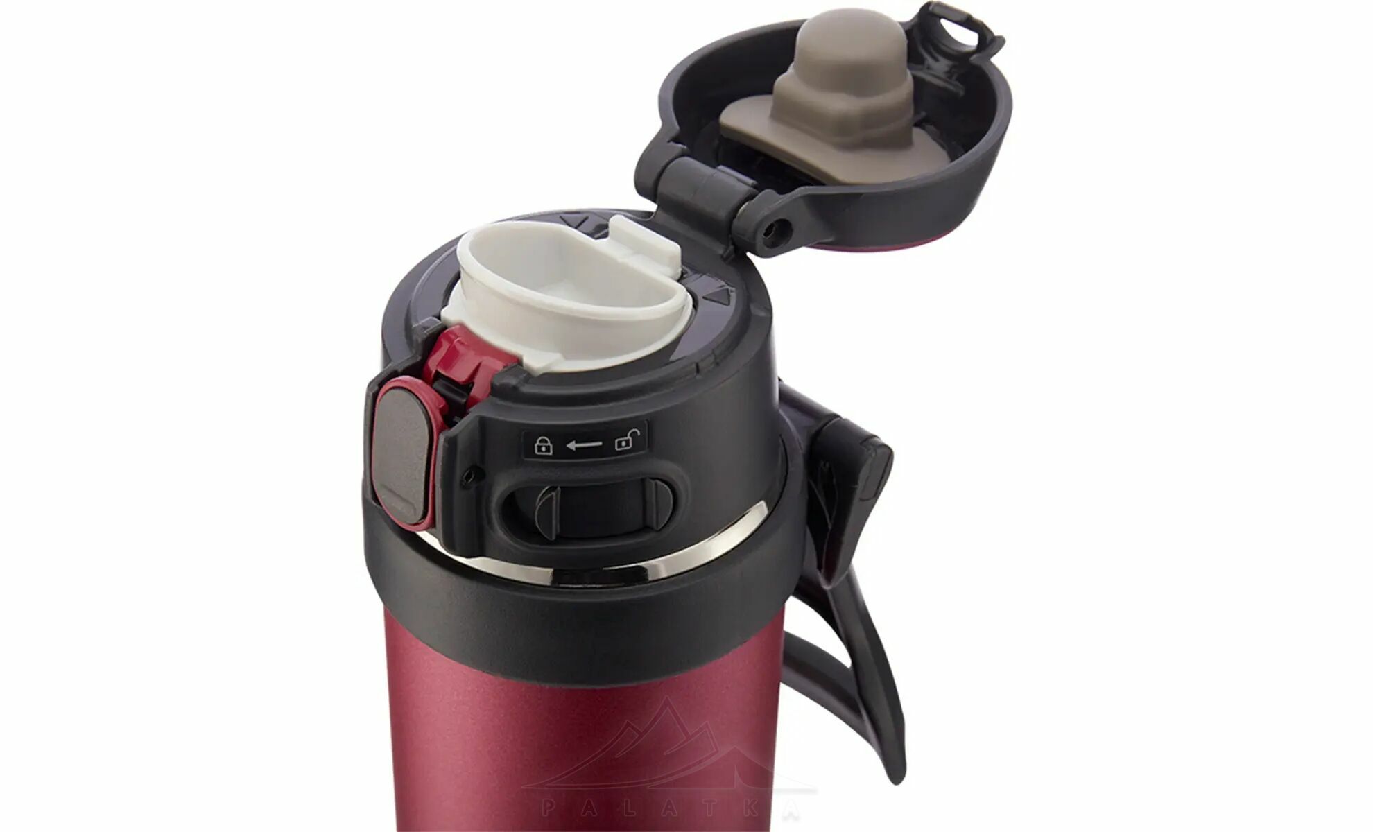 - Герметична кришка з кнопковим механізмом — легко відкривається однією рукою, забезпечує зручне наливання в чашку та має запобіжник від випадкового відкривання й протікання.