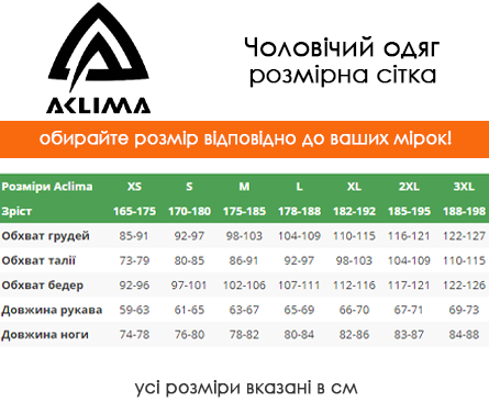 таблиця розмірів чоловічого одягу Aclima
