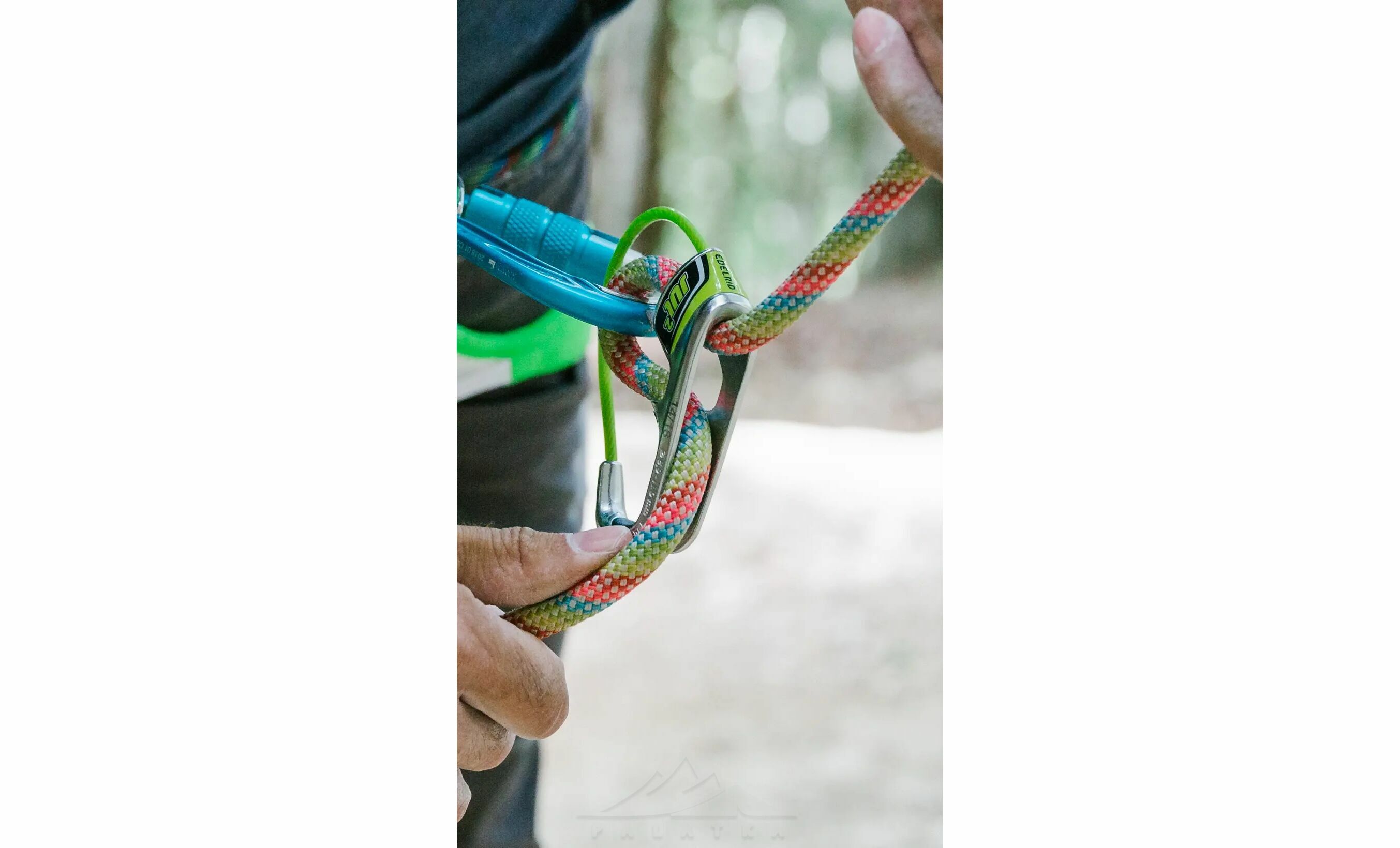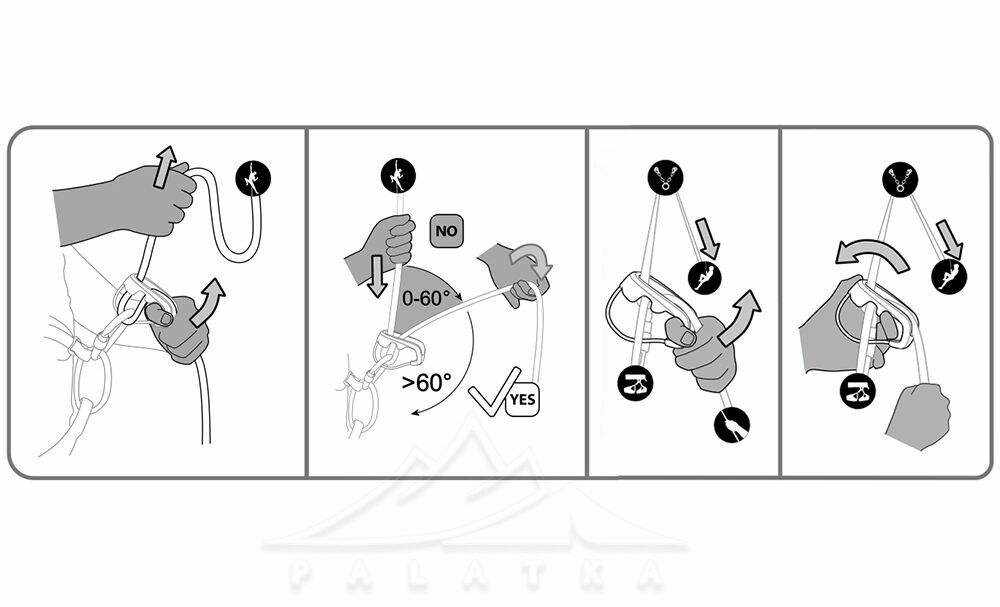 - На товстих або жорстких мотузках пристрій можна розвернути петлею до себе для зменшення тертя. Увага: у цьому випадку блокування не працює, обов’язково використовуйте прусик!