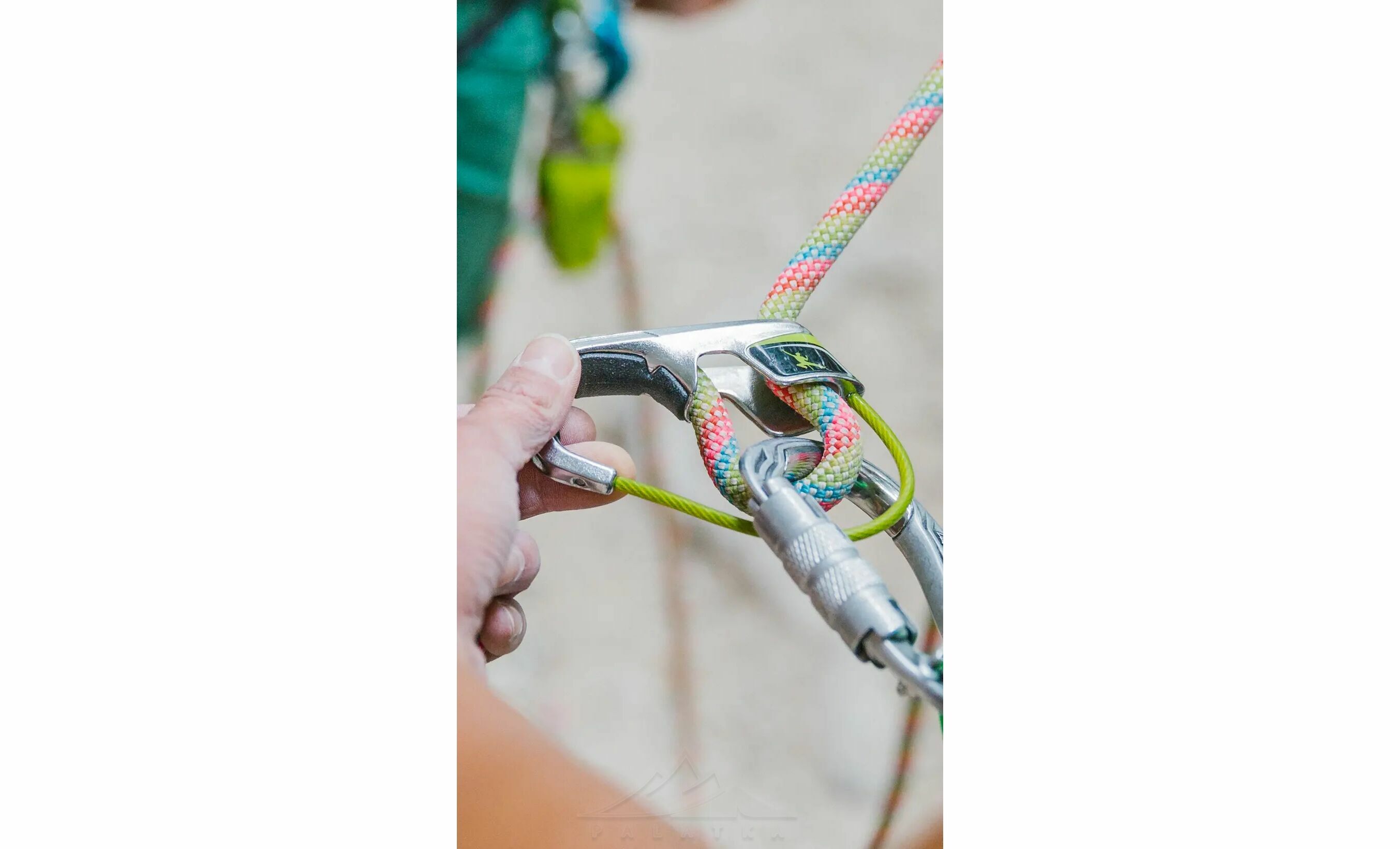- Для розблокування підніміть блокувальний карабін; у складних випадках використовуйте допоміжний карабін як важіль.