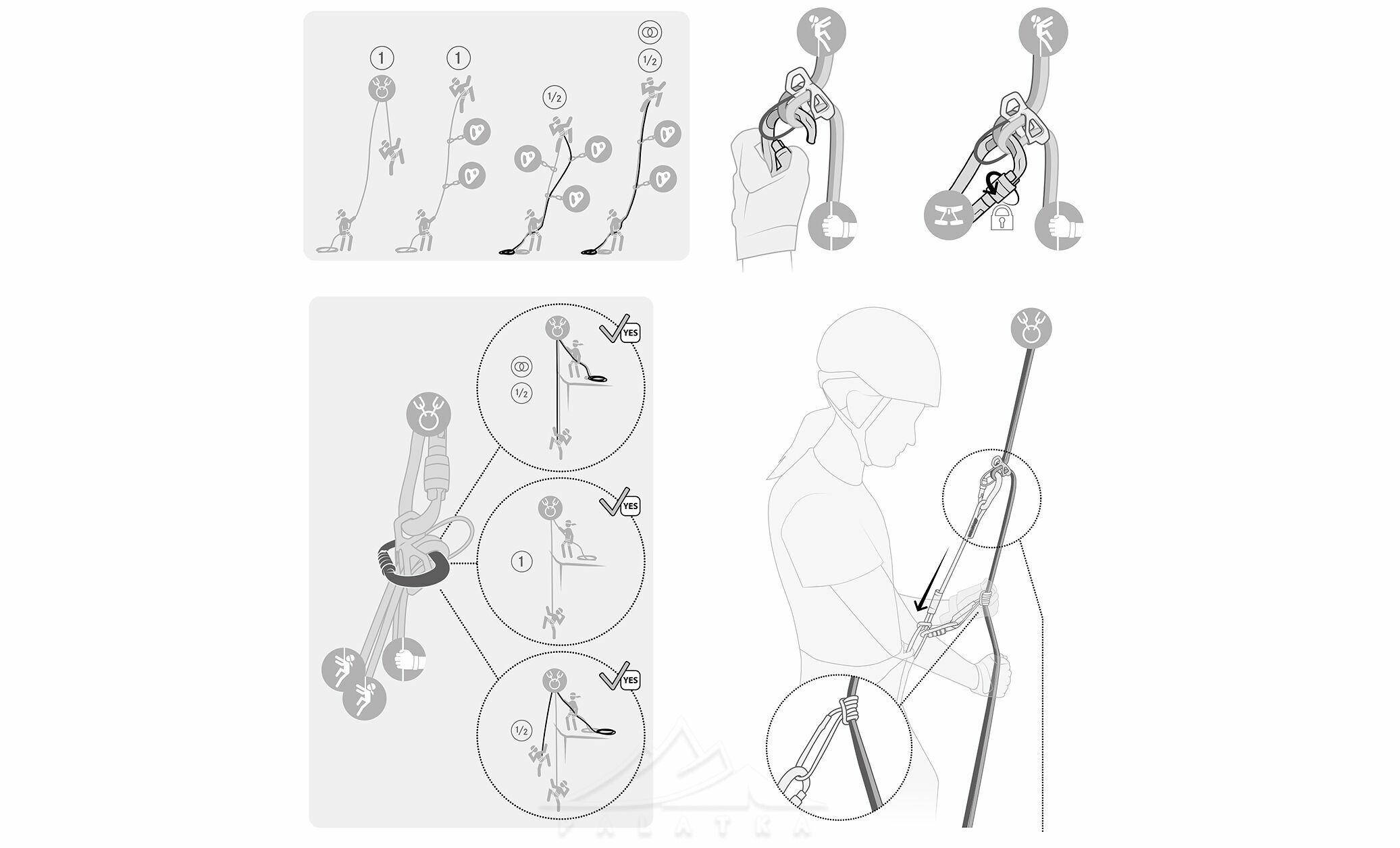 - На товстих або жорстких мотузках пристрій можна розвернути петлею до себе для зменшення тертя. Увага: у цьому випадку блокування не працює, обов’язково використовуйте прусик!