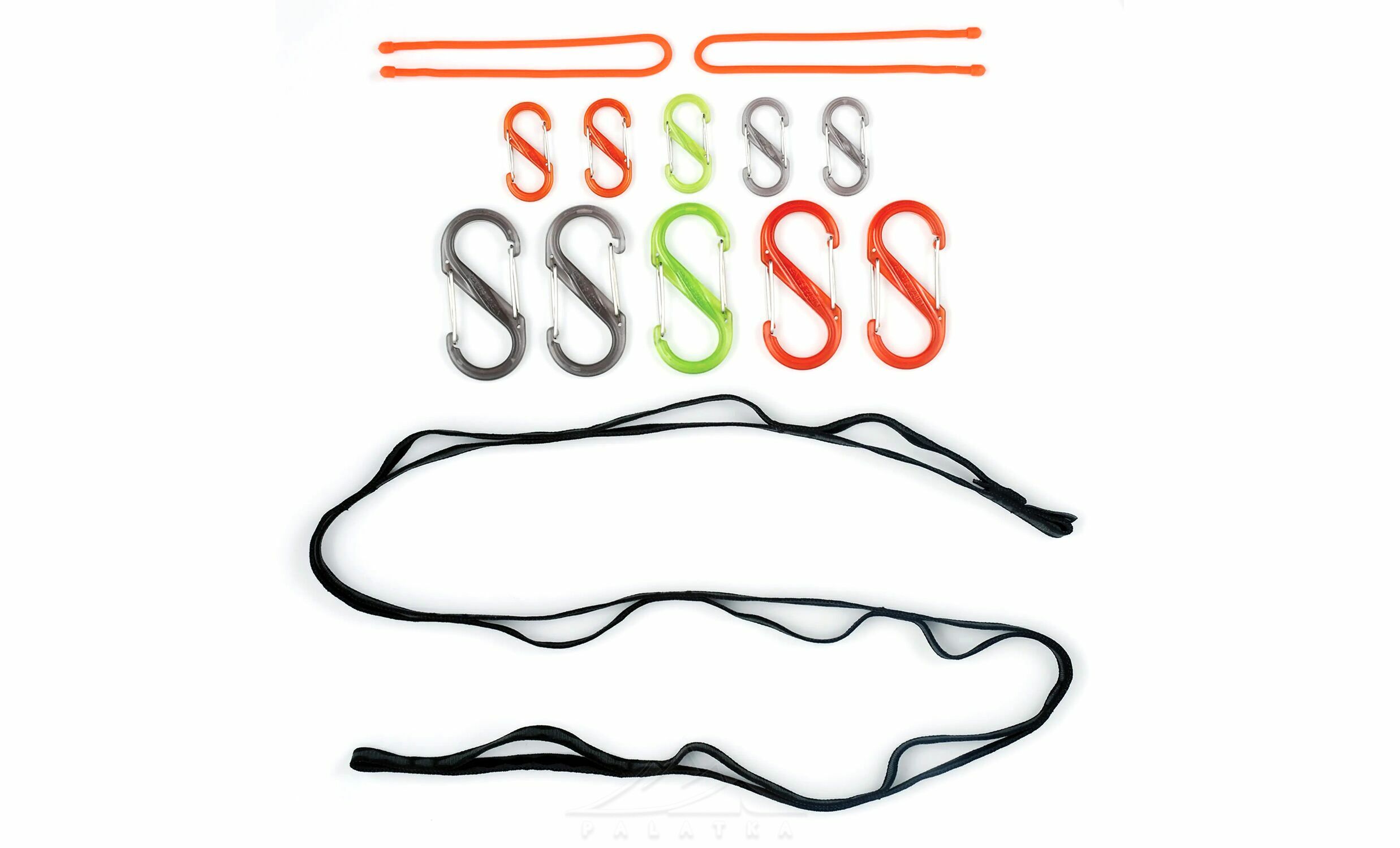 - До комплекту входить міцна стропа (довжина 122 см), 5 подвійних карабінів (8,9x4,2 см), 5 подвійних карабінів (5,2x2,5 см), 2 гнучкі стяжки (довжина 30,5 см).