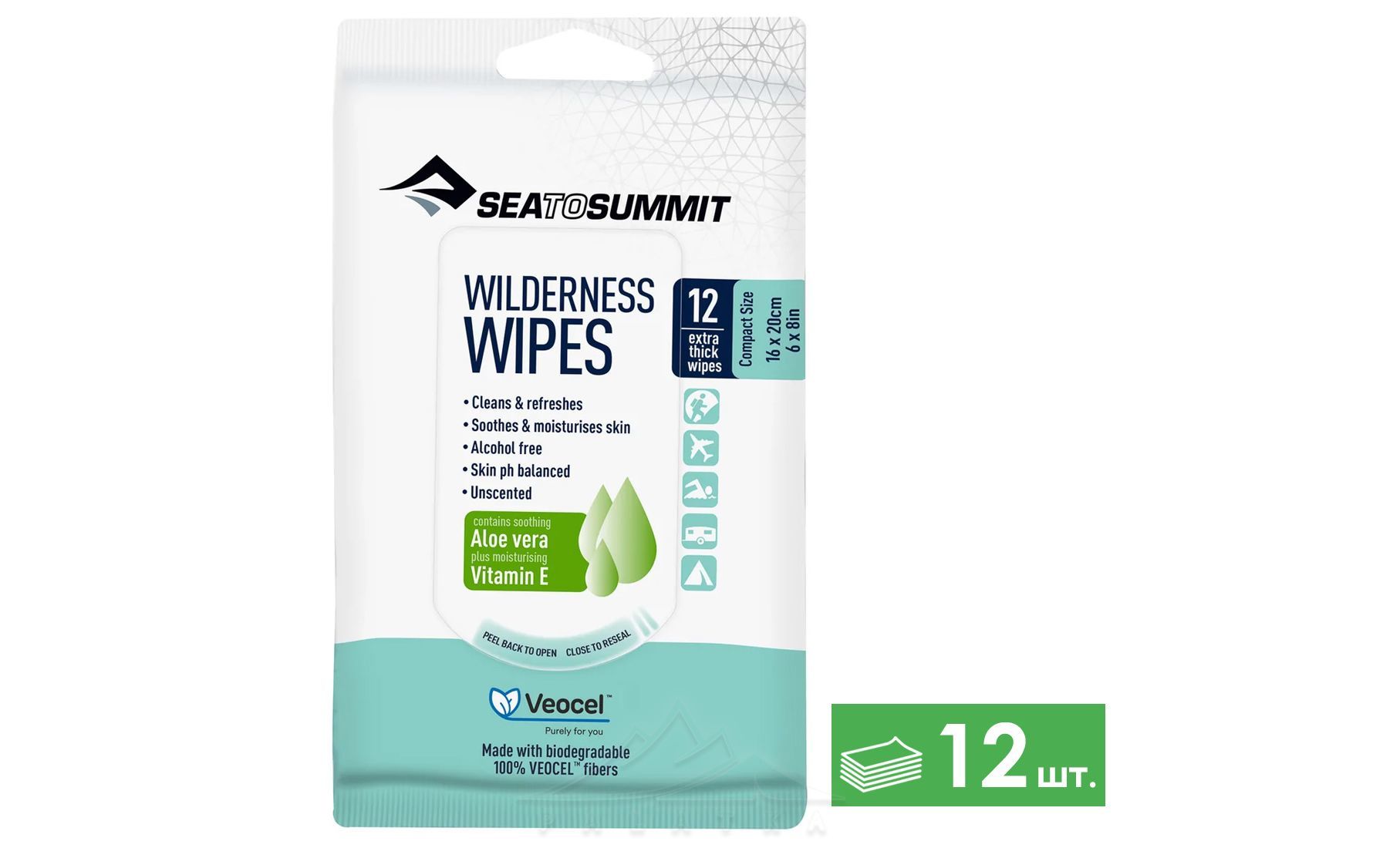 Sea to Summit Wilderness Wipes — м'які та екологічно безпечні вологі серветки з віскози, що містять алое вера і вітамін Е. Стануть в нагоді під час походів, подорожей, та для повсякденного використання.