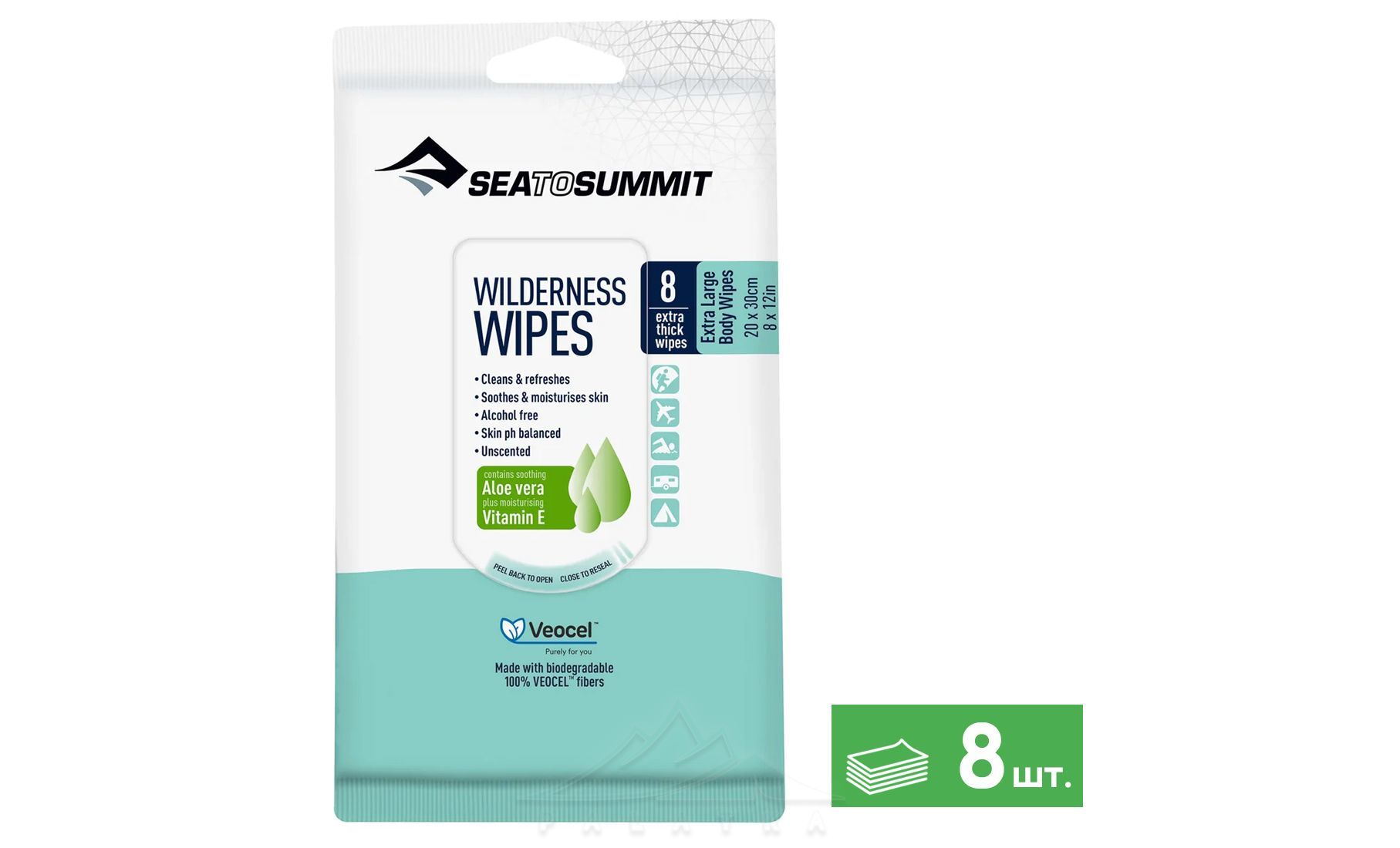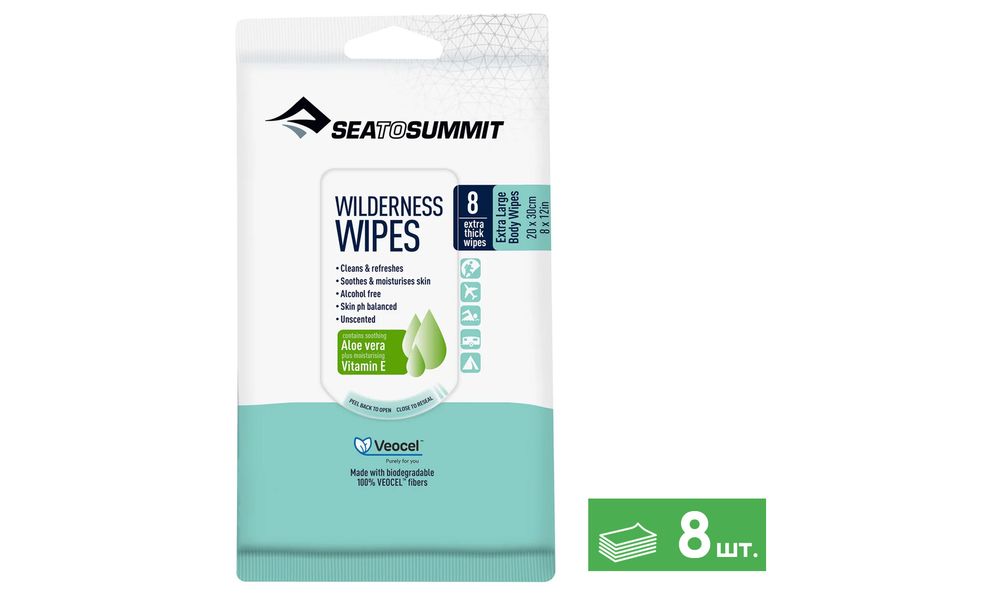 Sea to Summit Wilderness Wipes — м'які та екологічно безпечні вологі серветки з віскози, що містять алое вера і вітамін Е. Стануть в нагоді під час походів, подорожей, та для повсякденного використання.