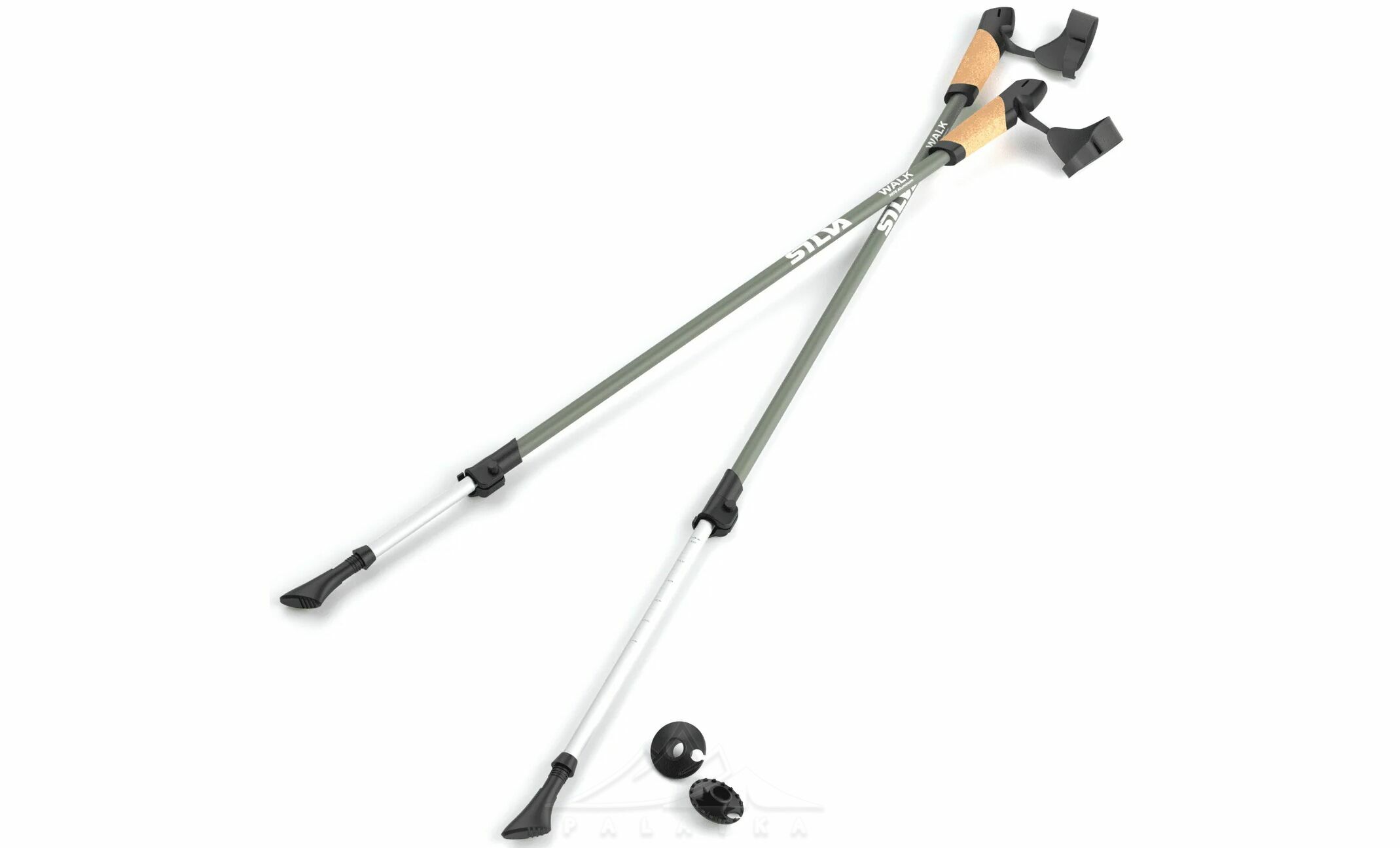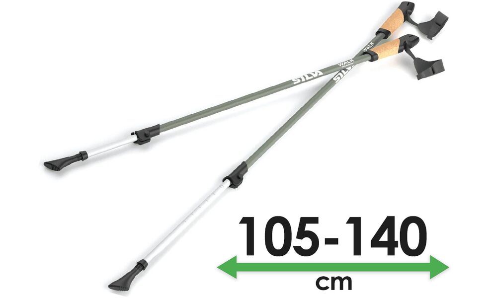 Палиці для скандинавської ходьби Silva Walking Aluminum Cork — виготовлені з алюмінію 7075, мають коркові руків'я для гарного зчеплення та максимального комфорту, з ремінцями на зап’ясті. Ремені на зап’ясті легко регулюються і дозволяють виконувати повний діапазон рухів під час швидкої ходьби. Довжину палиць можна регулювати в діапазоні 105-140 см за допомогою зовнішнього замка Twist-Lock. В комплекті гумові чобітки та кільця.