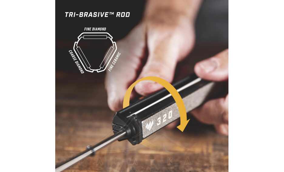 - 3-сторонній камінь Tri-Brasive® зі змінними абразивними поверхнями: алмазна 320 гріт — для базового заточування, алмазна 600 гріт — для усунення дрібних нерівностей на поверхні, керамічна — для фінальної шліфовки ріжучої кромки.