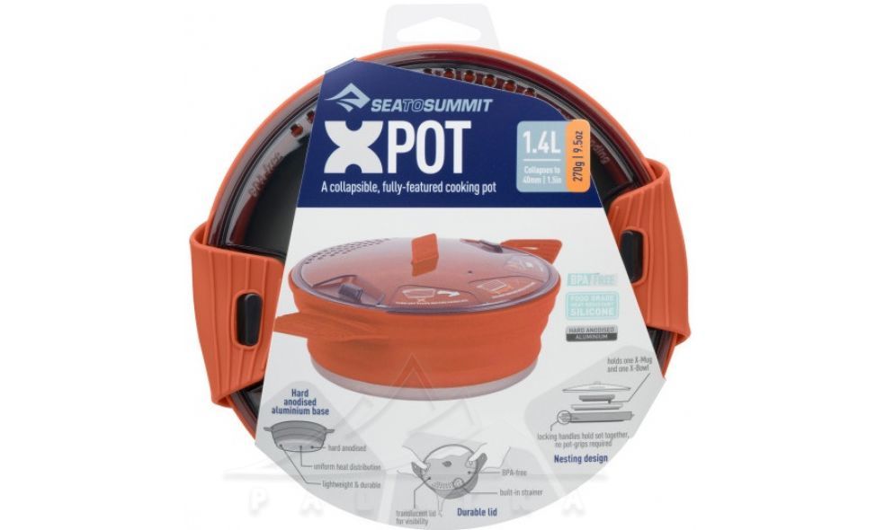Каструля Sea to Summit X-Pot розроблена для приготування їжі в походах. Стінки виготовлені з термостійкого харчового силікону та основа зроблена з андованого алюмінію, який є легким та міцним. Кастрюля складається і має дуже компактні розміри. Підходить для туристів, для яких важлива зручність.