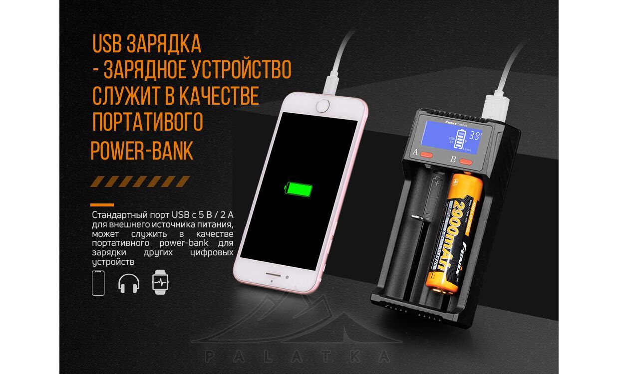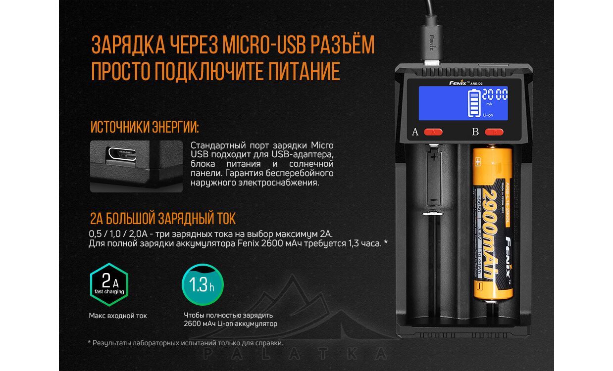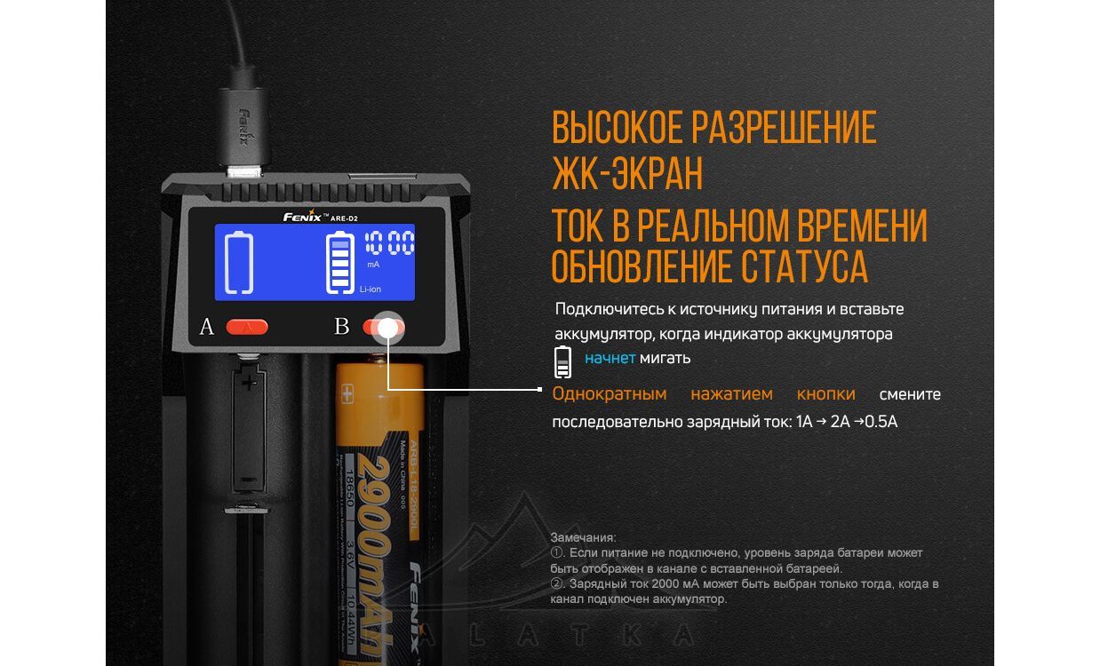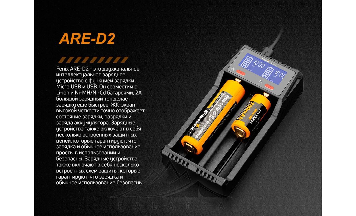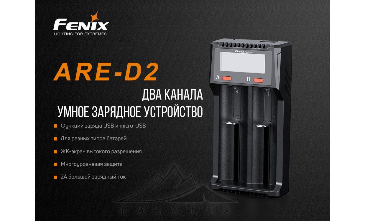Зарядний пристрій Fenix ARE-D2 — зручна та універсальна зарядка на 2 слоти для тих, хто користується різними акумуляторами в ліхтарях, налобниках та іншій техніці. Підійде, якщо вам потрібно заряджати два елементи одночасно й бачити статус кожного на екрані.