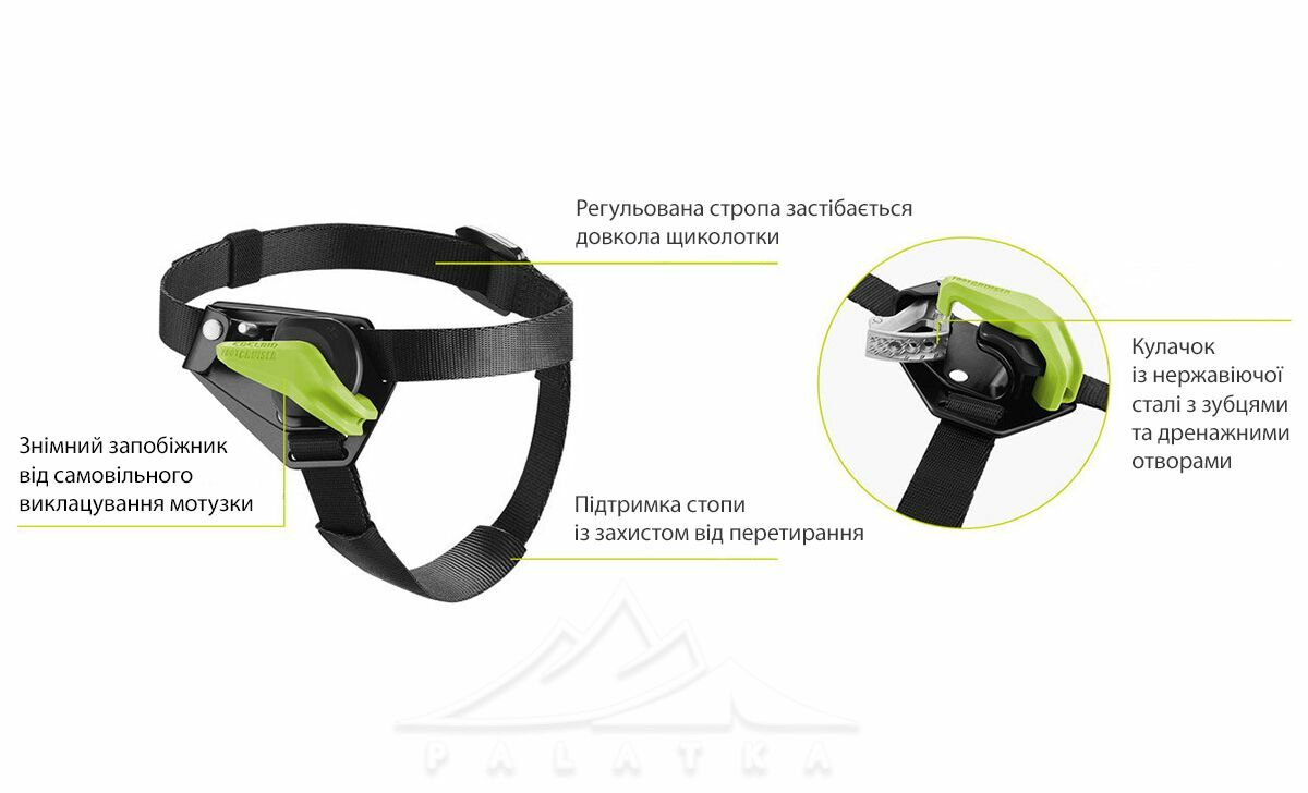 • Стропа посилена додатковим шаром матеріалу для захисту від стирання об підошву та абразиви; довжина регулюється за допомогою пряжки.