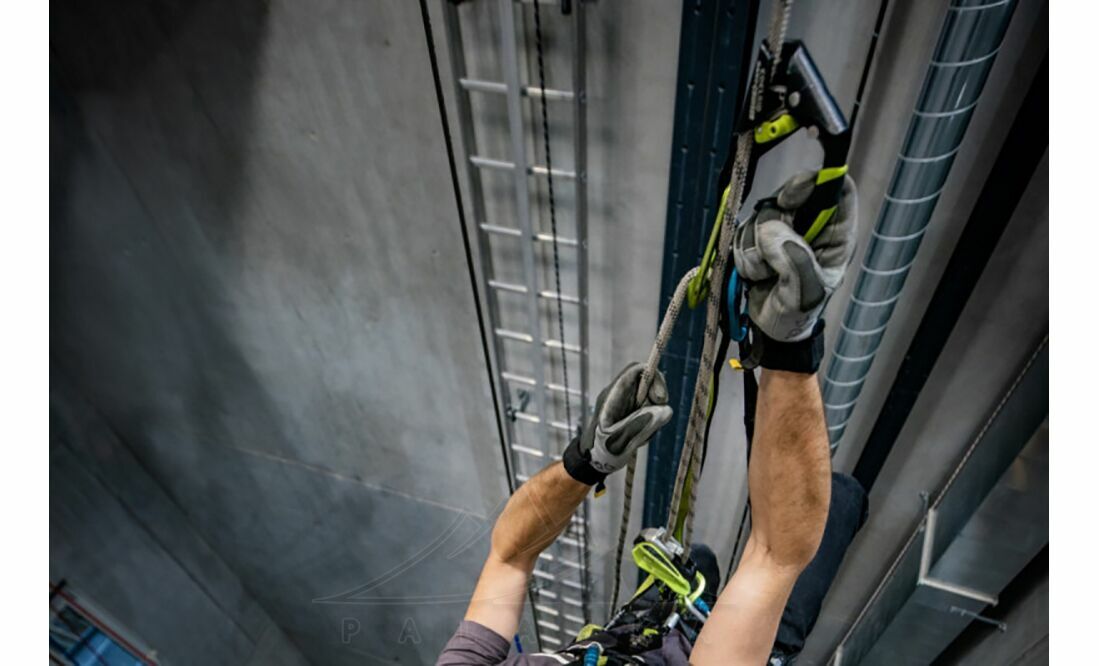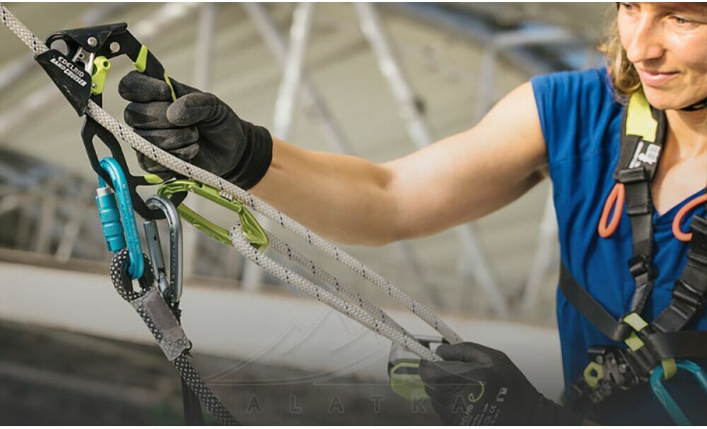 - Верхній отвір страховки запобігає самовільному виклацуванню мотузки під час руху по похилій мотузці.